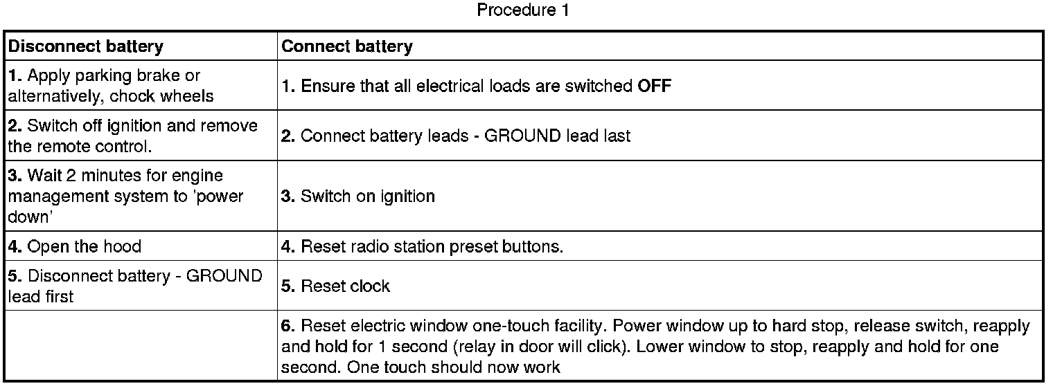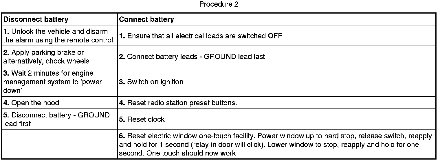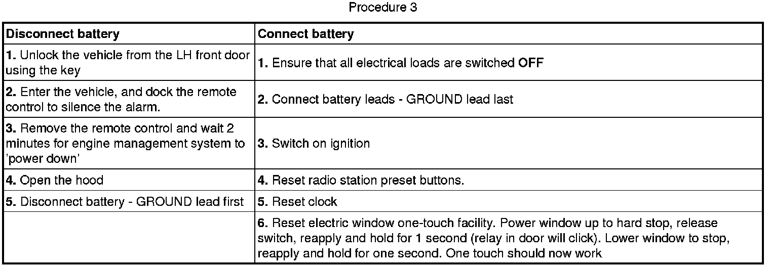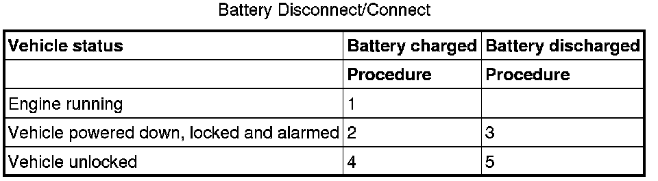 CAUTION: The vehicle status and battery condition must be established before attempting battery disconnect/connect. Reference must be then made to the following table to establish the relevant procedure to be followed.