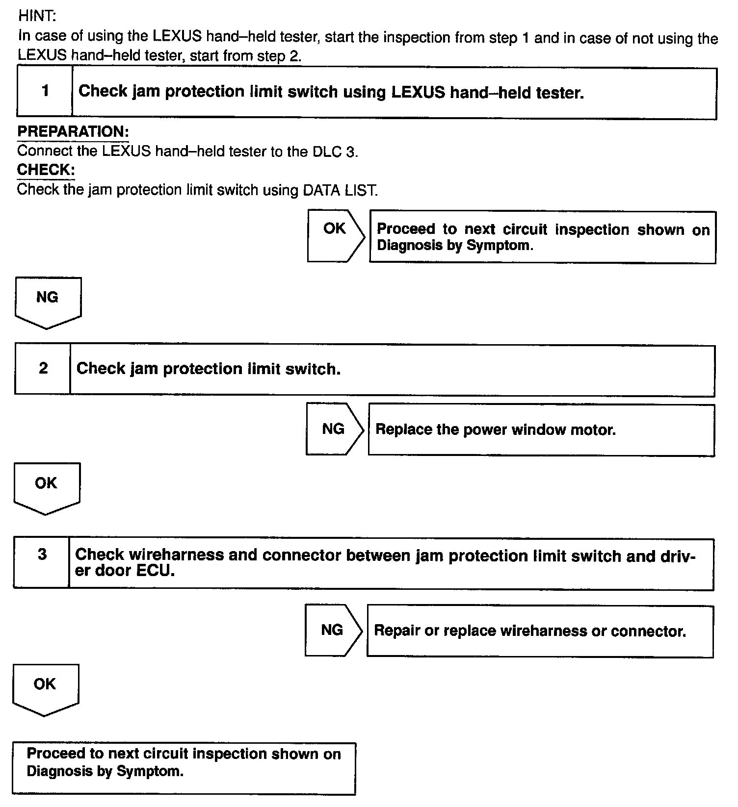 CIRCUIT DESCRIPTIONJam protection limit switch is built-in the power window motor. This switch functions to turn "OFF" before the top dead center, and ECU reads this "OFF" signal resulting in closing the window fully.
