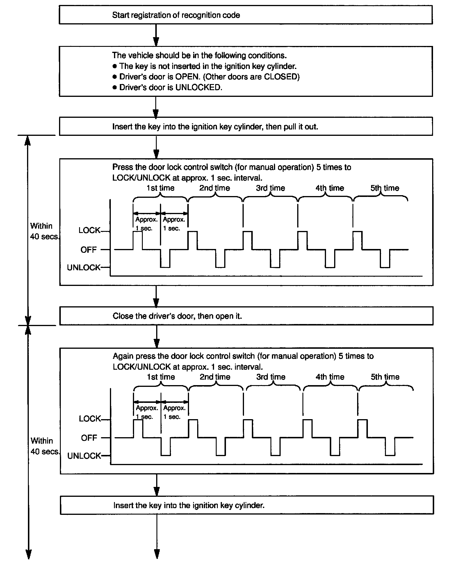 b. Follow the chart on the following pages to register the transmitter recognition code at the wireless door lock control receiver.