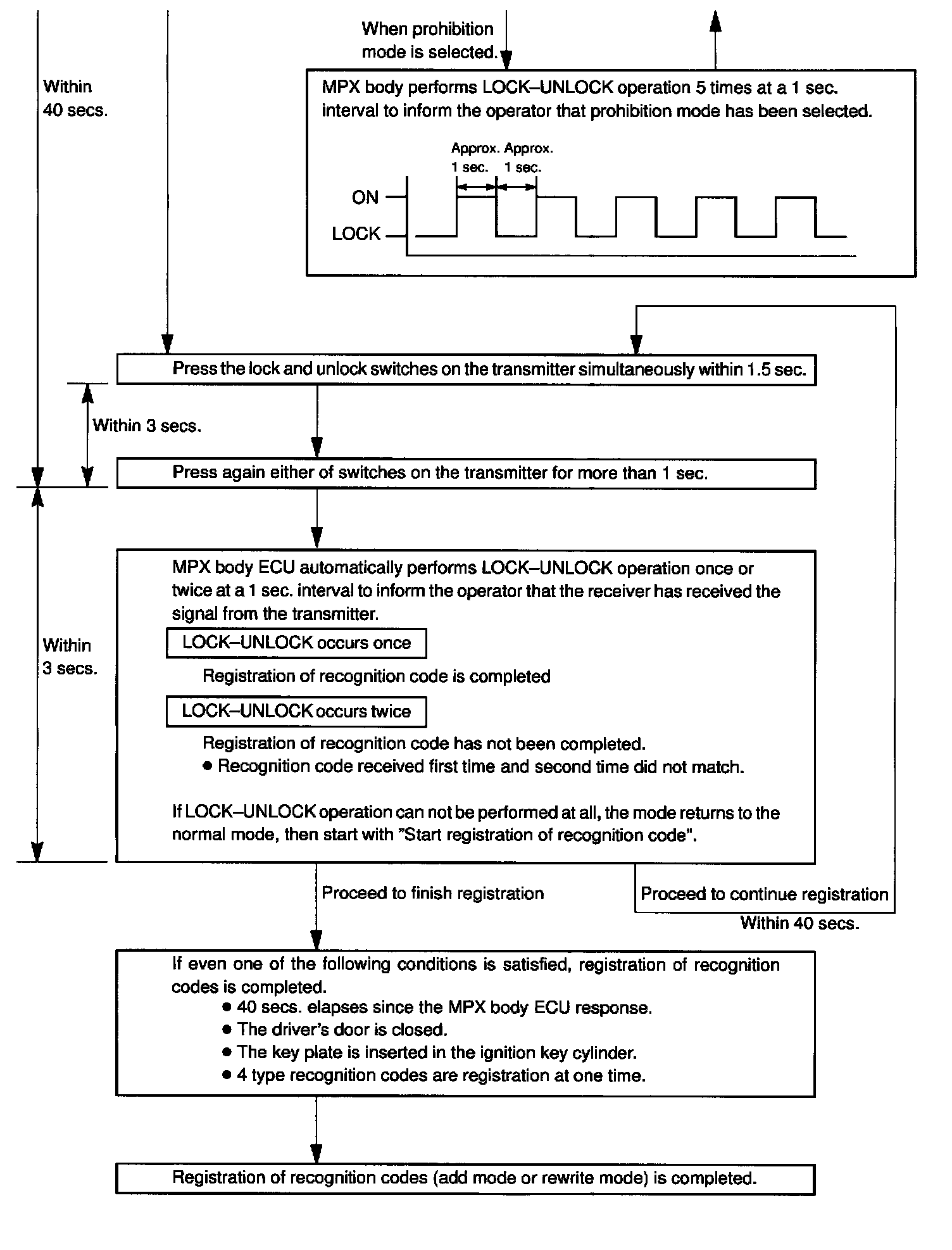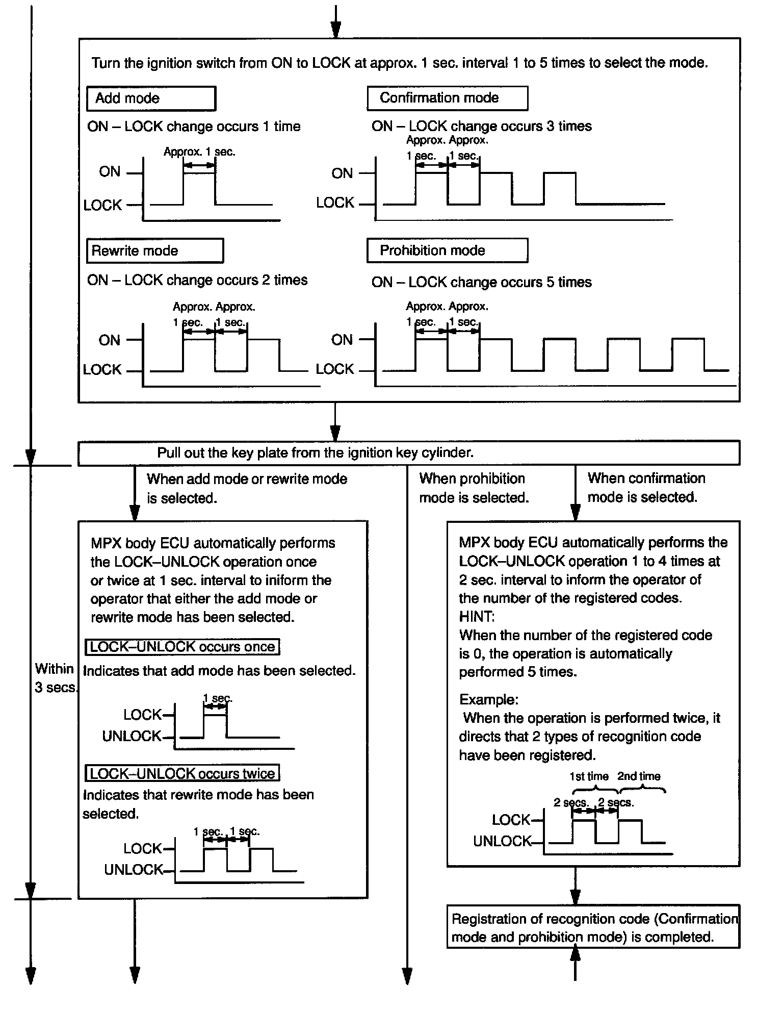 - The add mode is used to retain codes already registered while you register new recognition codes.This mode is used when adding a transmitter.However, if the number of registered codes exceeds 4 codes, previously registered codes are correspondingly erased in order, starting from the first registered code.