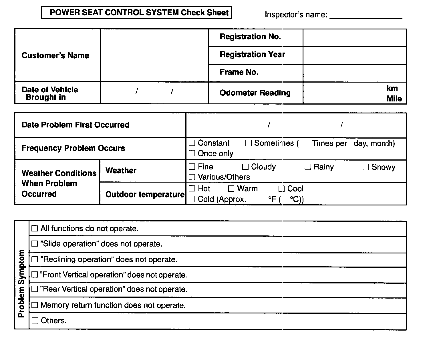 Power Seat Control System Check Sheet: