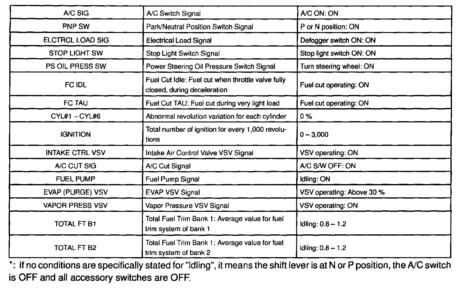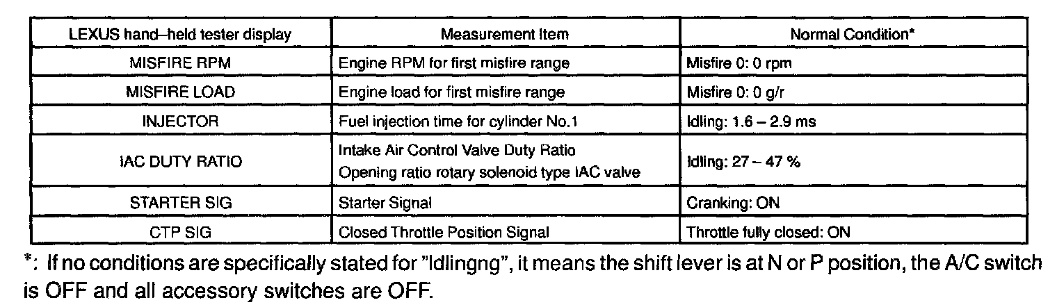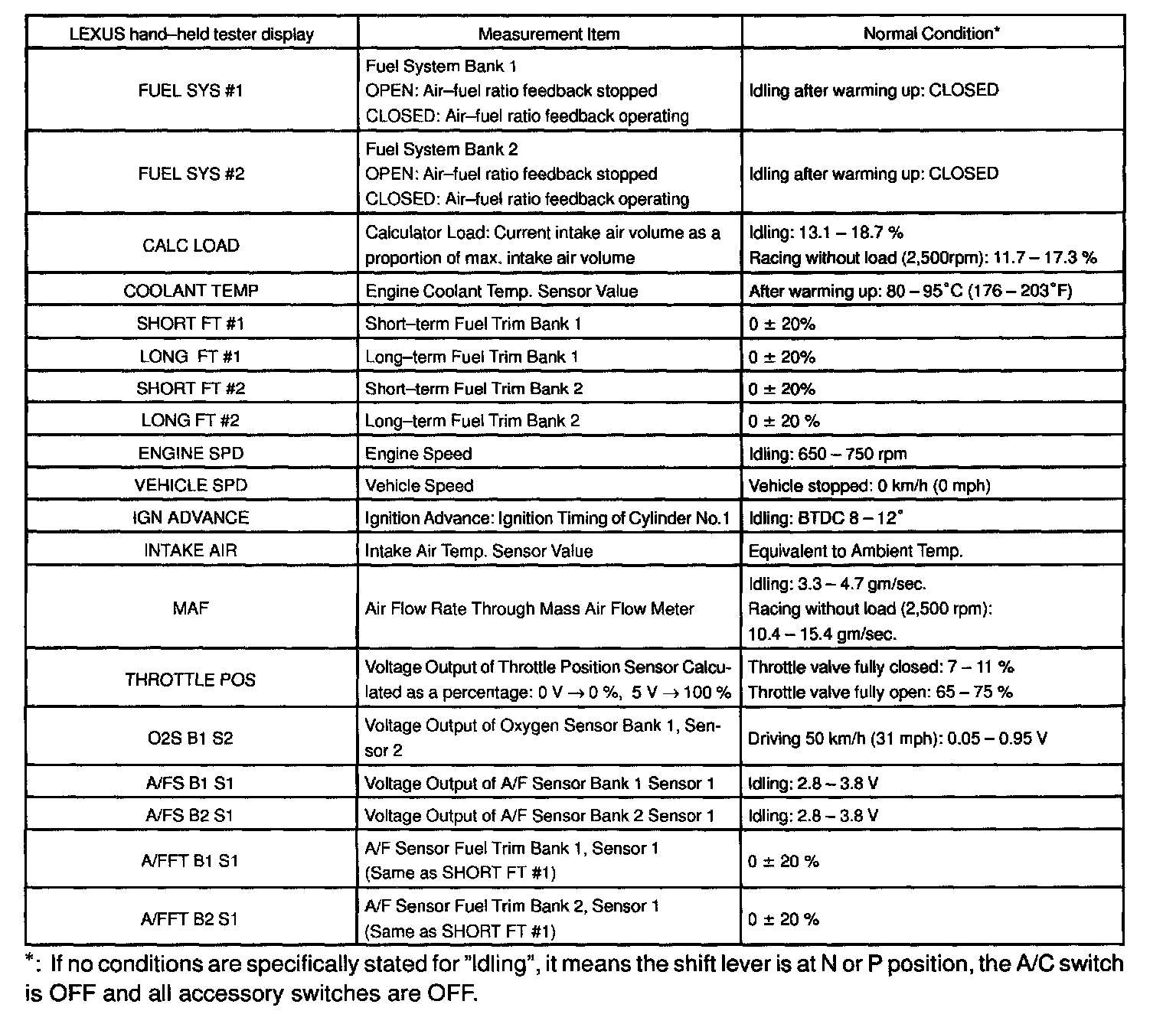 NORMAL ENGINE OPERATING CONDITIONNOTE: The values given for "Normal Condition" are representative values, so a vehicle may still be normal even if its value from those listed here. So do not decide whether a part is faulty or not solely according to the "Normal Condition" here.
