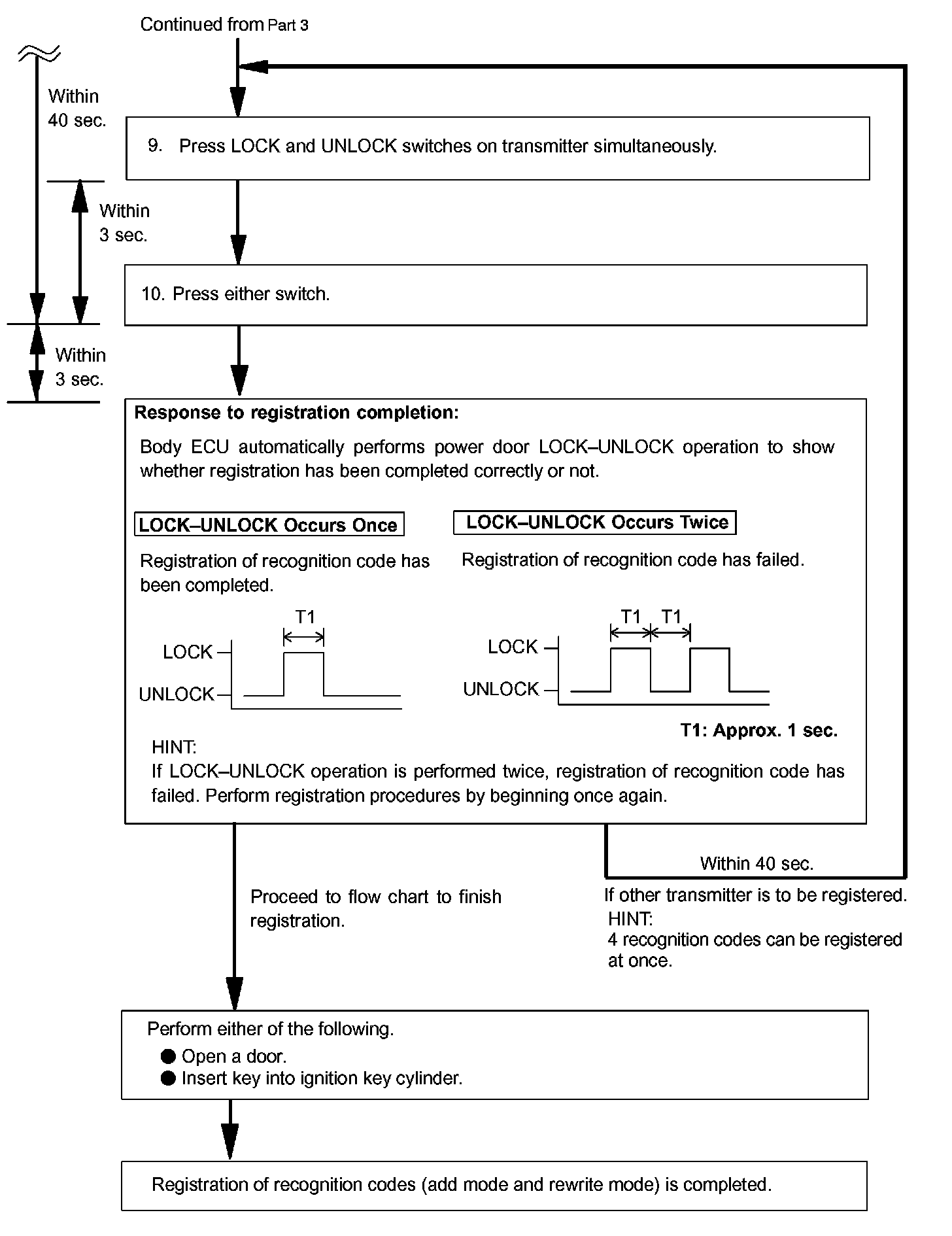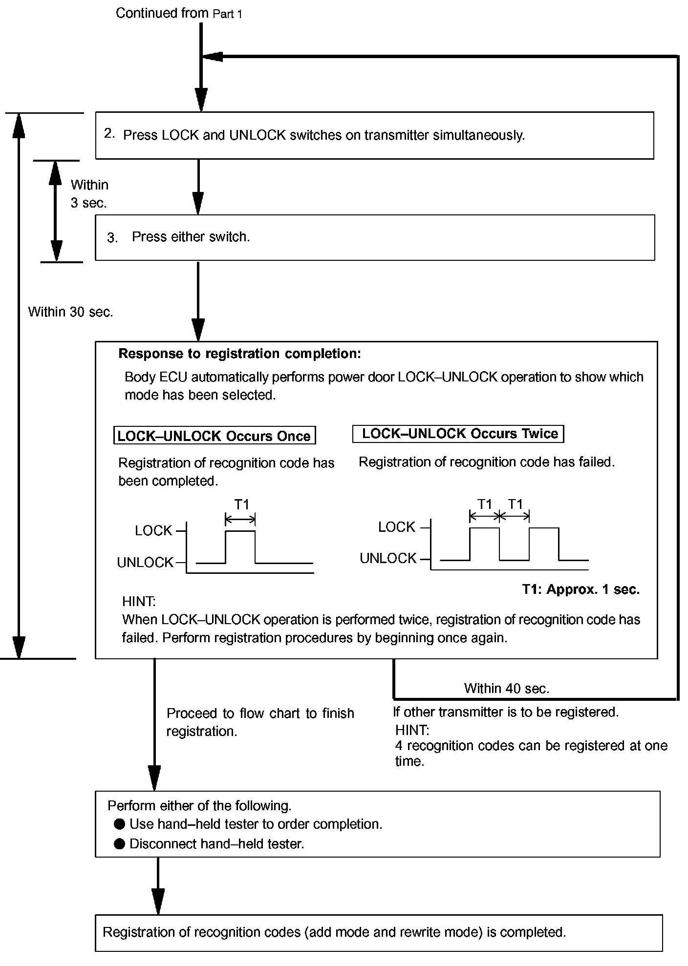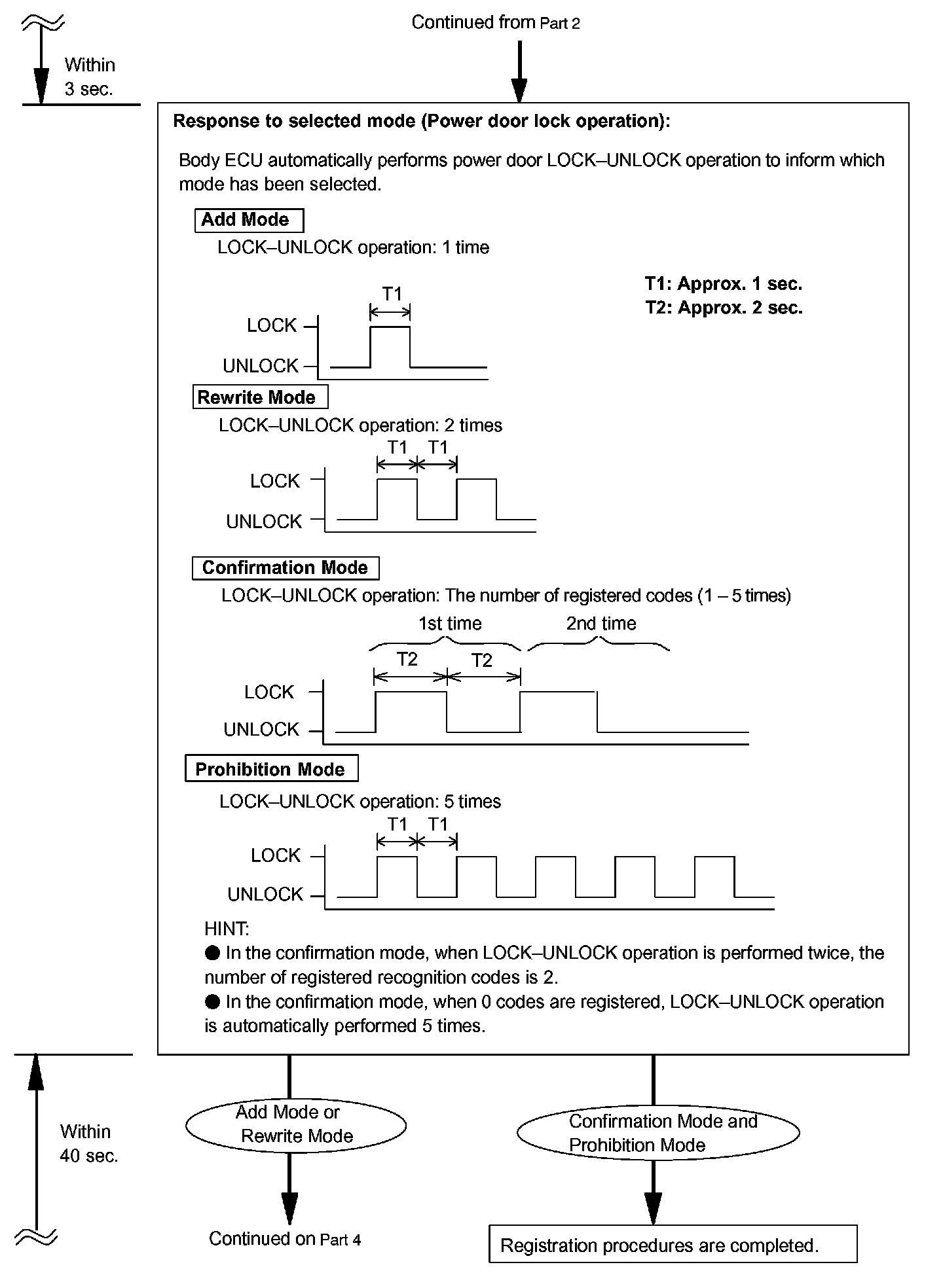 - The add mode is used to register new recognition codes while still retaining codes already registered. This mode is used when a new transmitter is added. If the number of registered codes exceeds 4, the previously registered codes will be erased in order, starting from the first registered code.