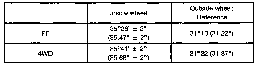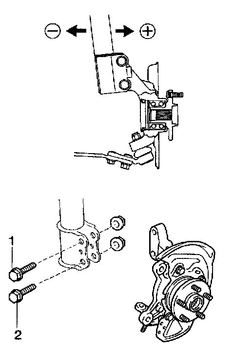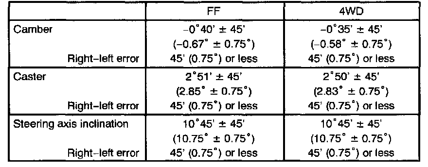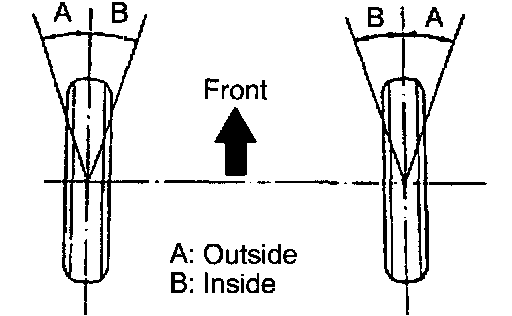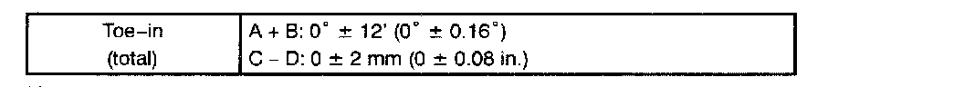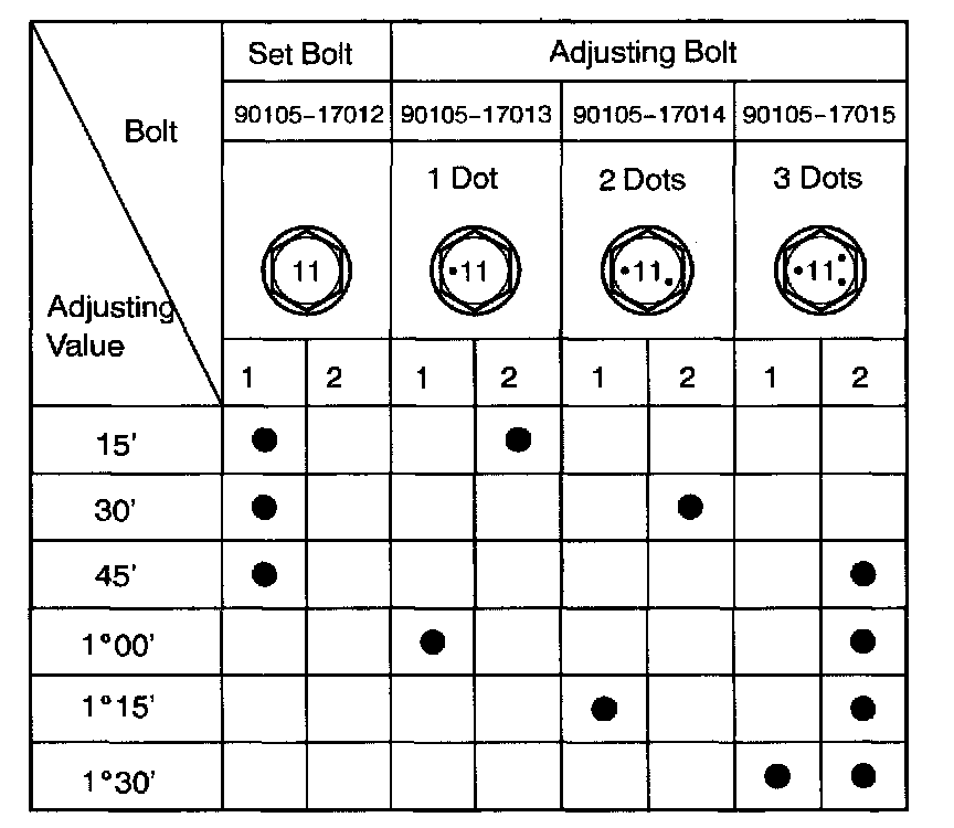 ^ Adjusting value for the set bolts is 6' to 30' (0.1° to 0.5°). If the camber is not within the specified value, estimate how much additional camber adjustment will be required, and select the camber adjusting bolt.