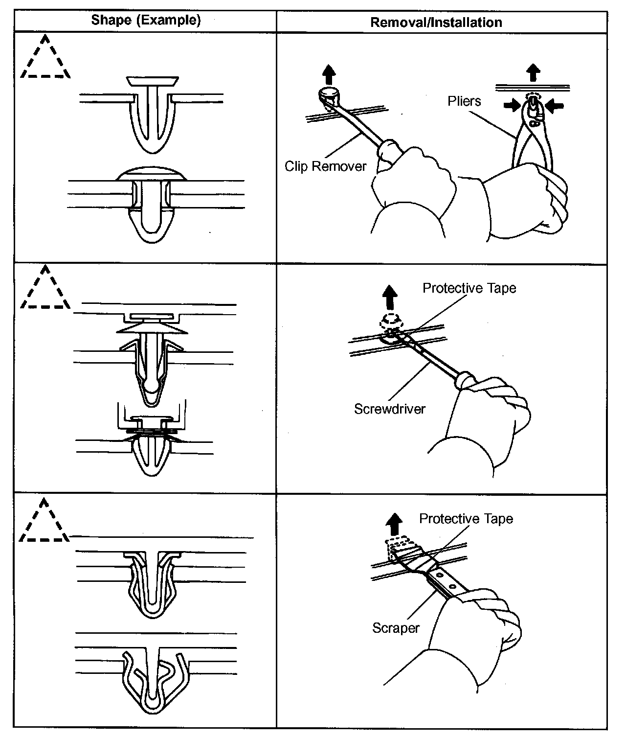 1. The removal and installation methods of typical clips used in body parts are shown in the table.