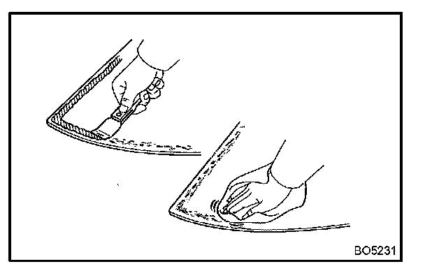 1. Using a knife, cut away any rough adhesive on the contact surface of the vehicle body to ensure the appropriate surface shape.
