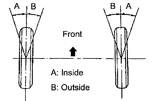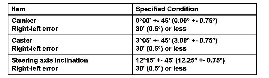 If the steering axis inclination is not within the specified value, after the camber and caster have been correctly adjusted, recheck the steering knuckle and front wheel for wearing or looseness.