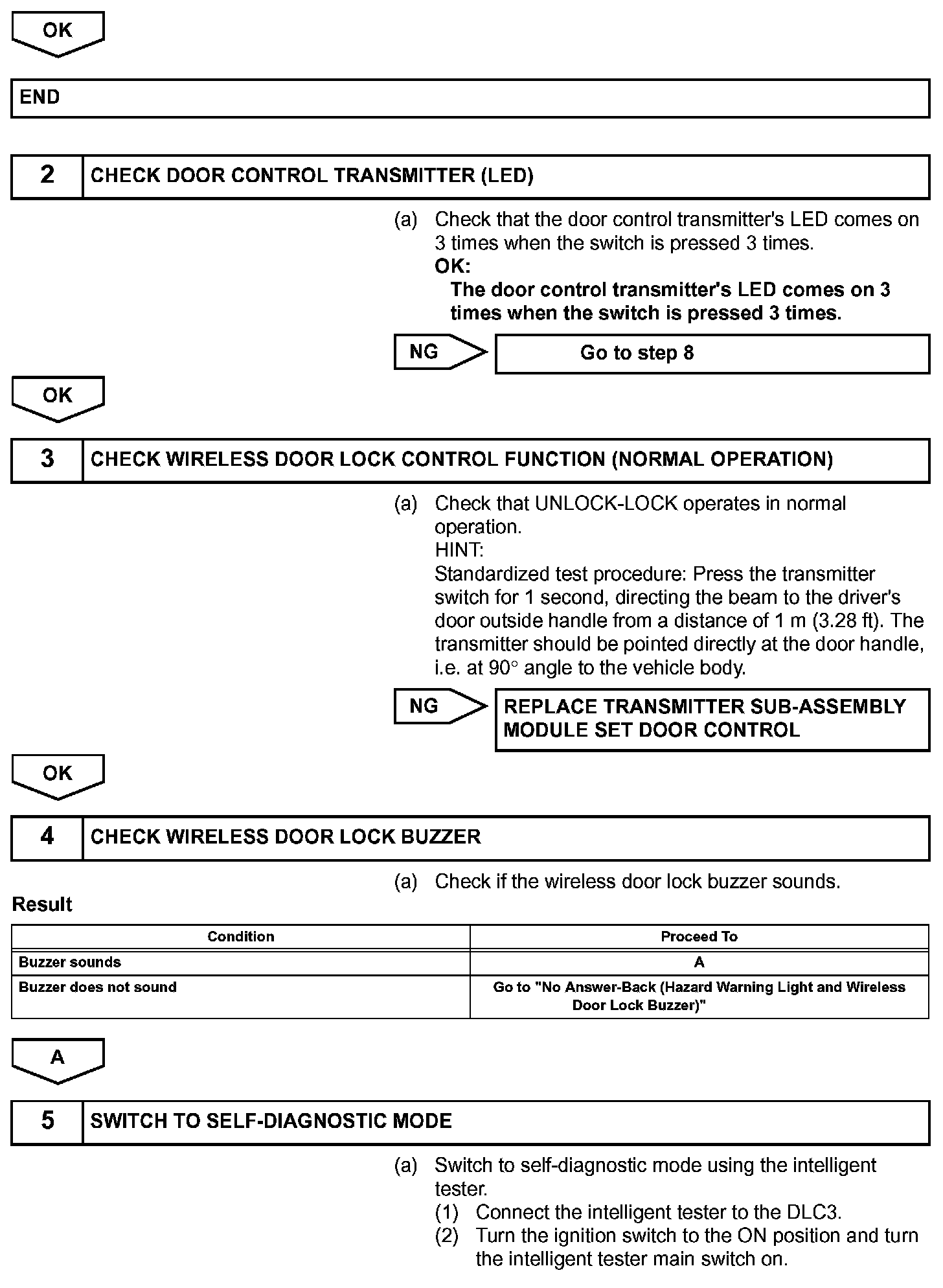 The door control receiver receives a signal from the transmitter and sends this signal to the multiplex network body ECU. The multiplex network body ECU then controls operation of the door locks, power windows and sliding roof. The power back door ECU also causes the power back door to open or close when it receives a signal from the transmitter via the door control receiver and multiplex network body ECU.