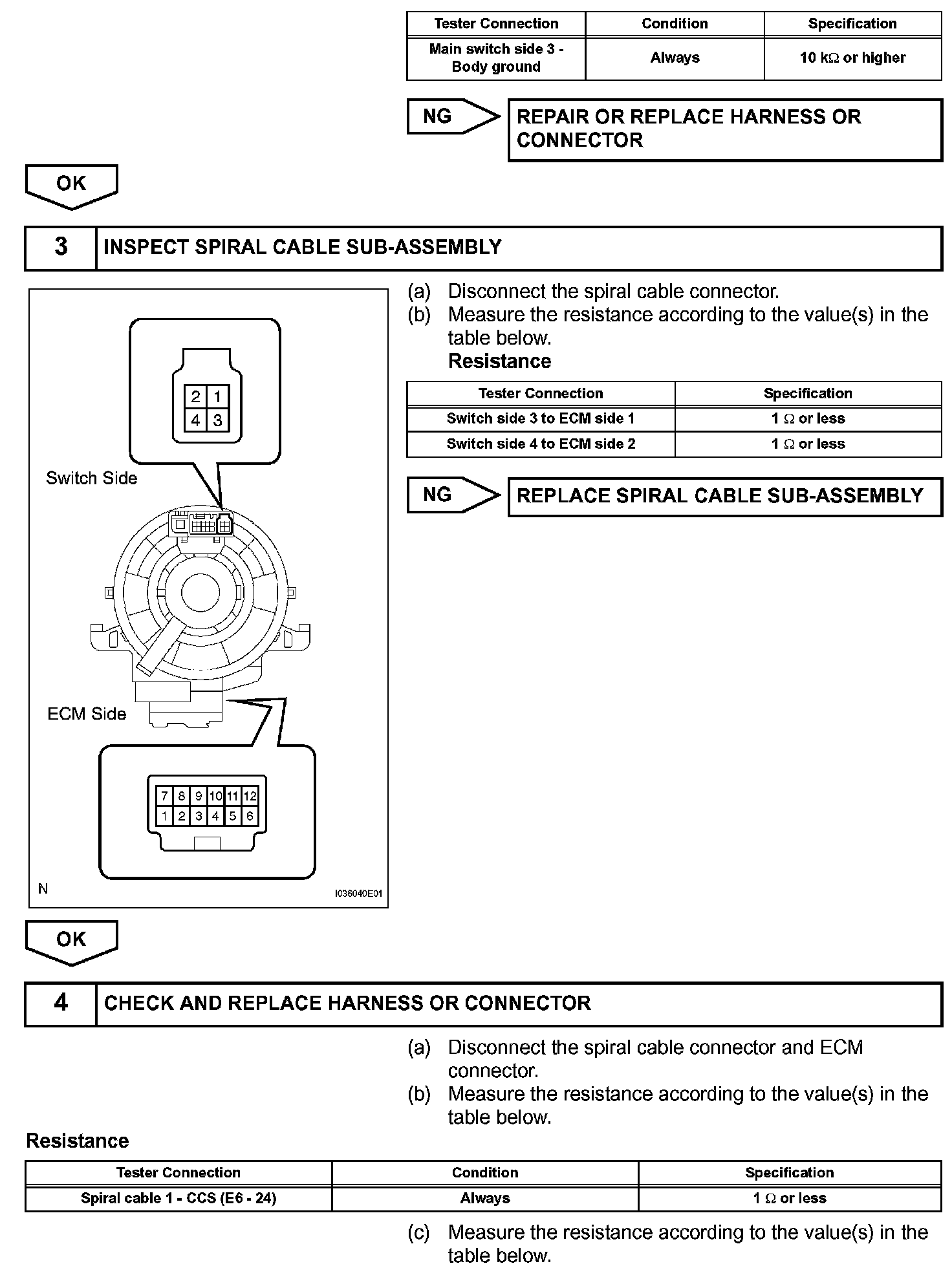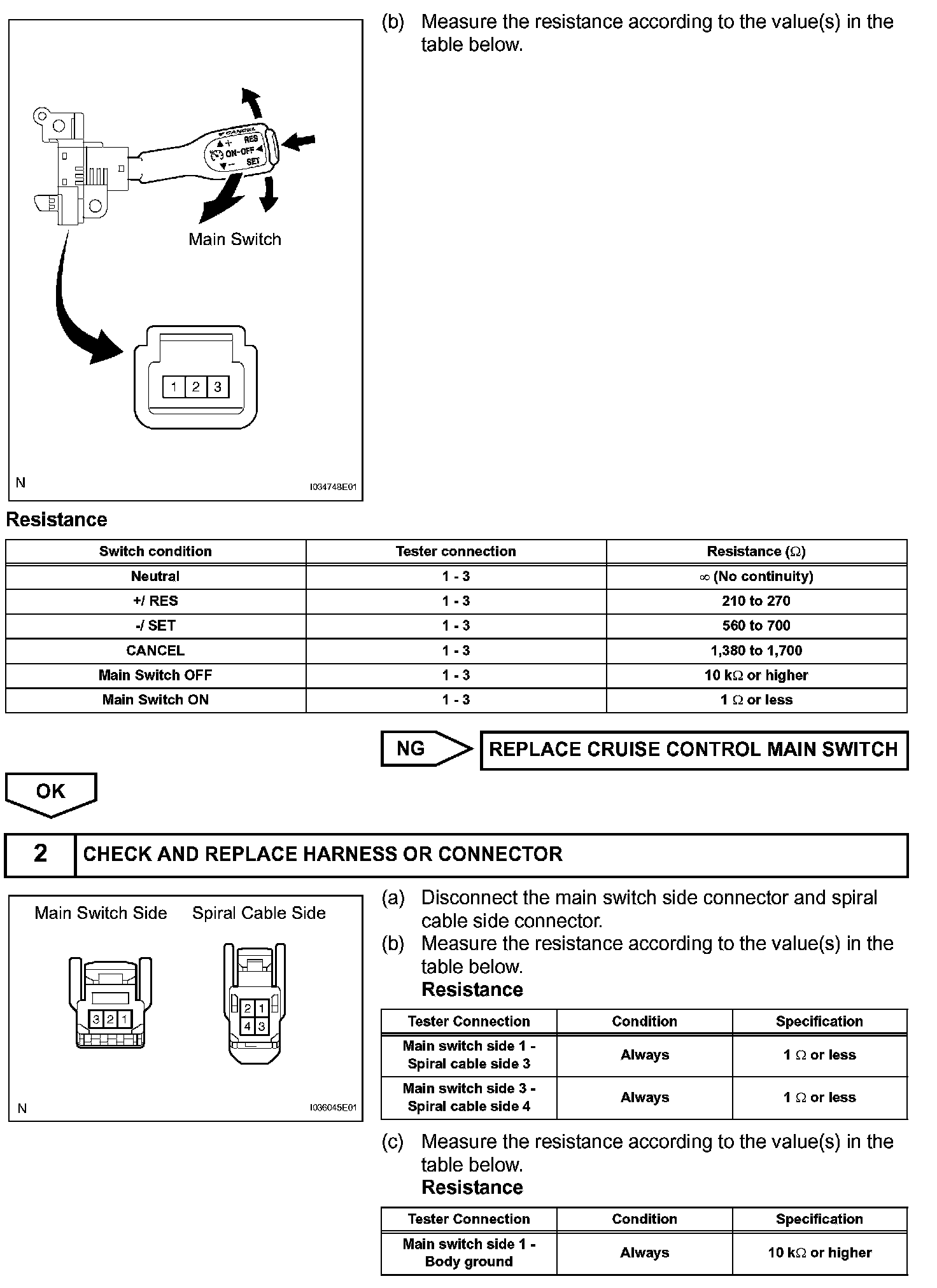 The cruise control main switch operates 7 functions: SET, COAST, TAP-DOWN, RESUME, ACCEL, TAPUP, and CANCEL. The SET, TAP-DOWN and COAST functions, and the RESUME, TAP-UP and ACCEL functions are operated with the same switch. The cruise control main switch is an automatic return type switch which turns on only while operating it in each arrow direction and turns off after releasing it. The internal contact point of the cruise control main switch is turned on with the switch operation. Then the ECM reads the resistance value that has been changed by the switch operation to control SET, COAST, RESUME, ACCEL and CANCEL.