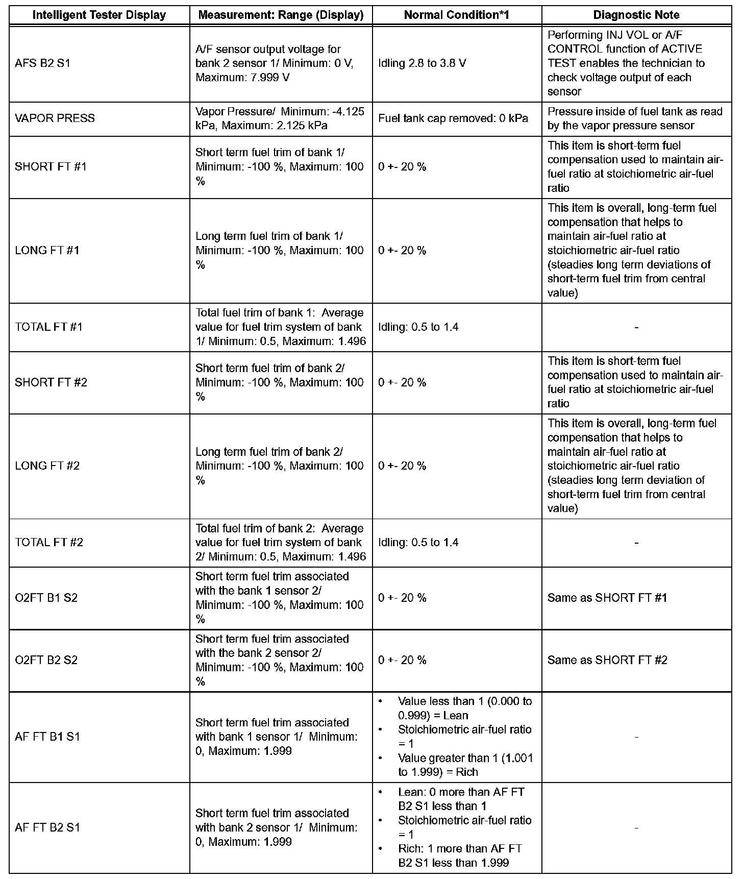 NOTE: In the table, the values listed under "Normal Condition" are reference values. Do not depend solely on these reference values when deciding whether a part is faulty or not.