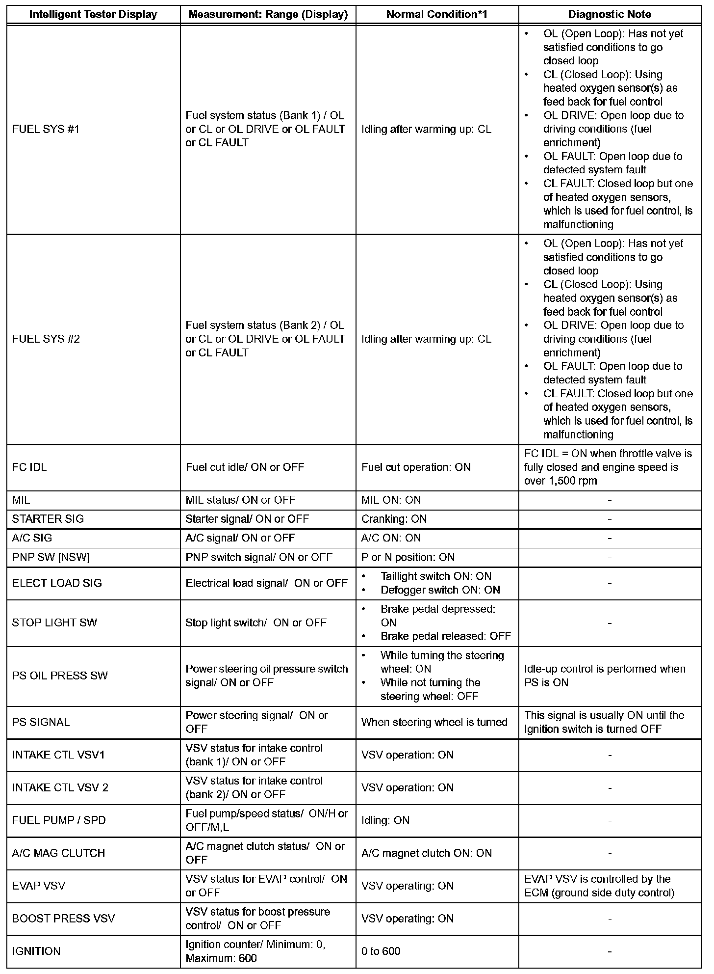 DATA LISTHINT: Using the intelligent tester's DATA LIST allows switch, sensor, actuator and other item values to be read without removing any parts. Reading the DATA LIST early in troubleshooting is one way to save time.