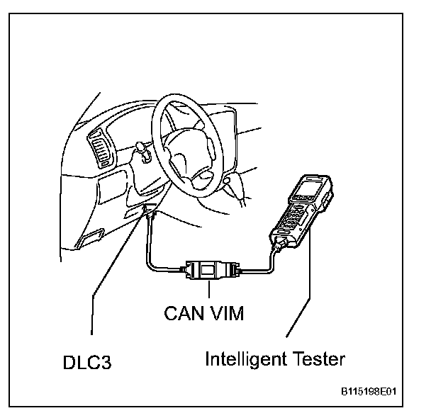 HINT: Connect the cable of the intelligent tester (with CAN VIM) to the DLC3, turn the ignition switch ON and attempt to use the tester. If the display indicates that a communication error has occurred, there is a problem either with the vehicle or with the tester.