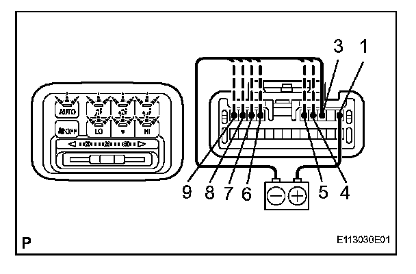 a. Connect the positive (+) lead from the battery to terminal 1 and negative (-) lead to each of the other terminals in order from 3 to 9, and then check that the indicator illuminates as shown in the chart.