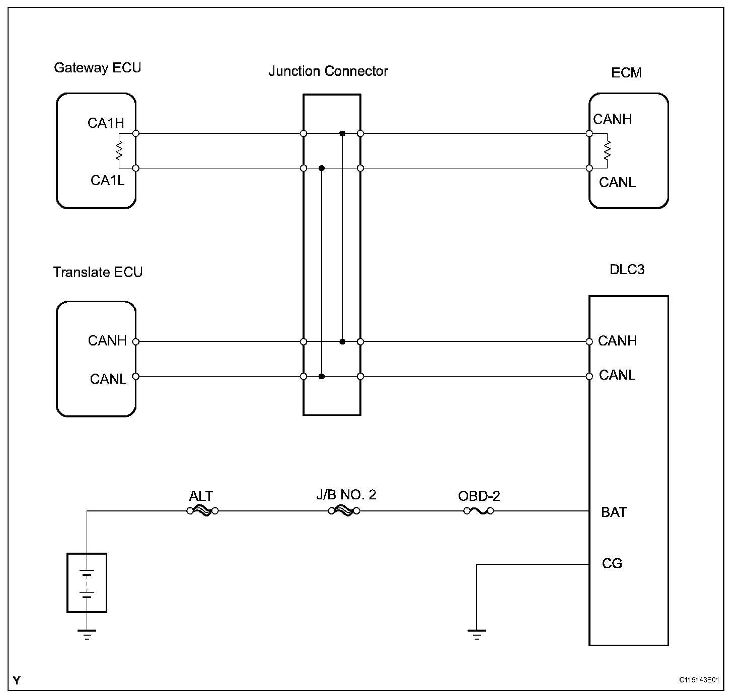 When any DTC for the CAN communication system is output, first measure the resistance between the terminals of the DLC3 to specify the trouble area, and check that there is no short in the CAN main bus line, between the CAN bus lines, to B+, or to GND.
