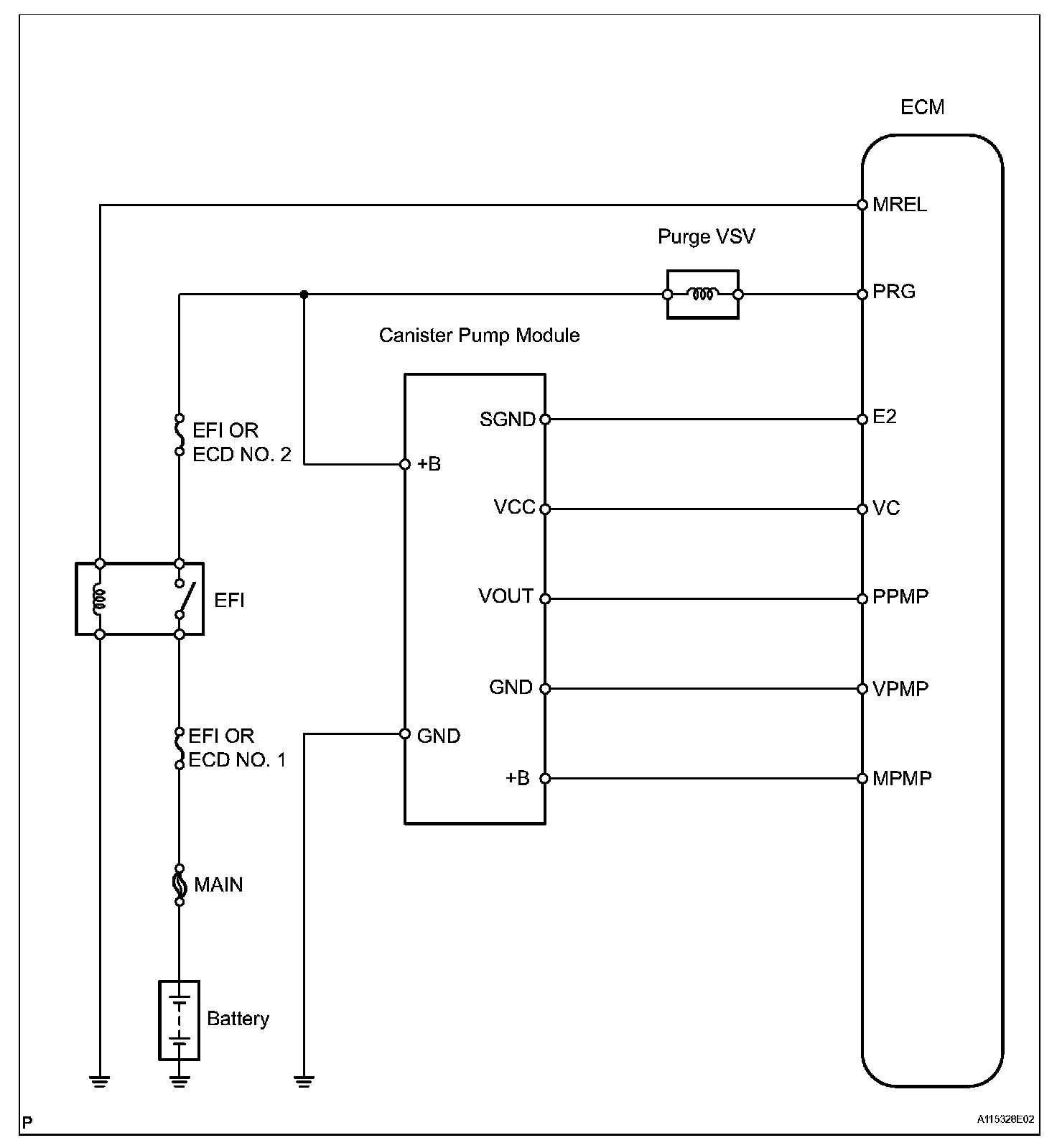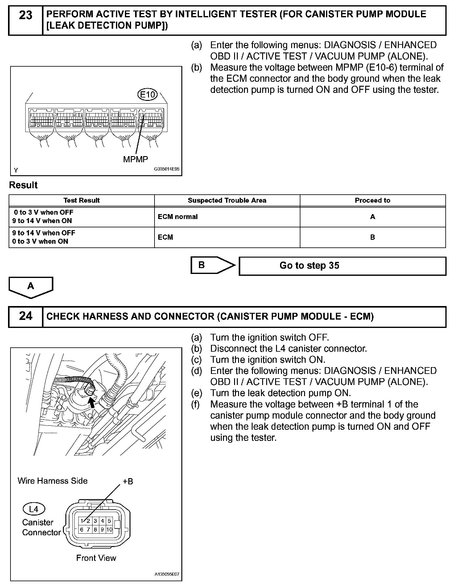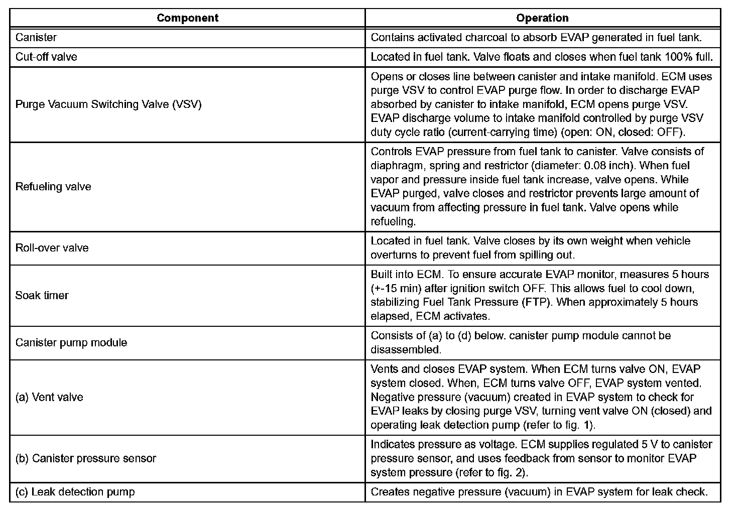 The leak detection pump creates negative pressure (vacuum) in the EVAP system and the pressure is measured. Finally, the ECM monitors for leaks from the EVAP system and malfunctions in both the canister pump module and purge VSV, based on the EVAP pressure.