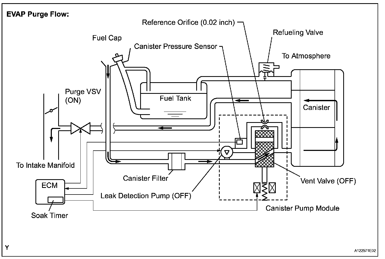 The purge flow volume is also determined by the intake manifold pressure. Atmospheric pressure is allowed into the canister through the vent valve to ensure that the purge flow is maintained when the negative pressure (vacuum) is applied to the canister. The following two monitors run to confirm appropriate EVAP system operation.