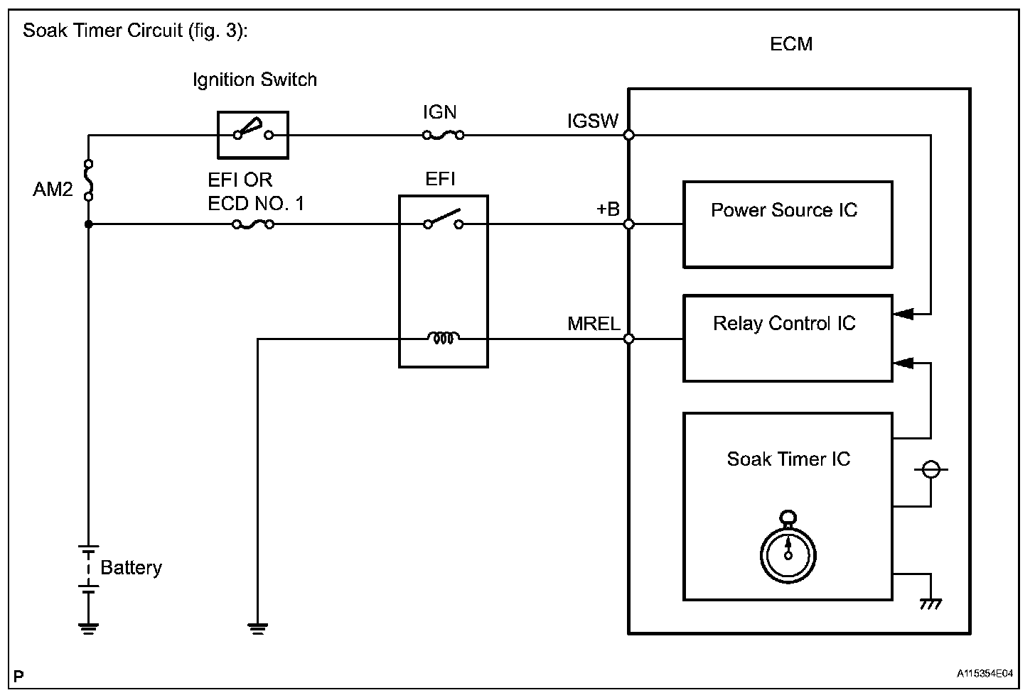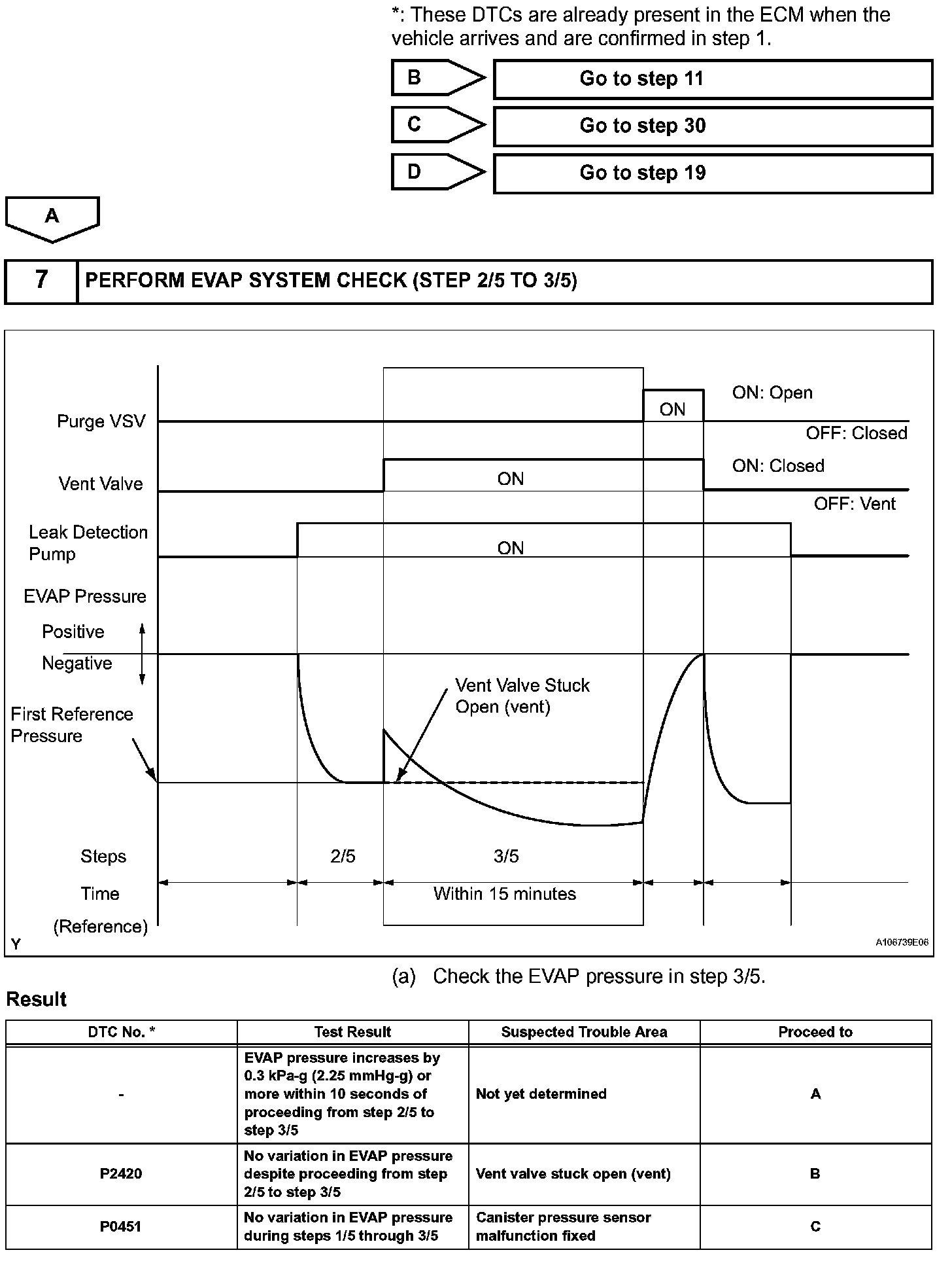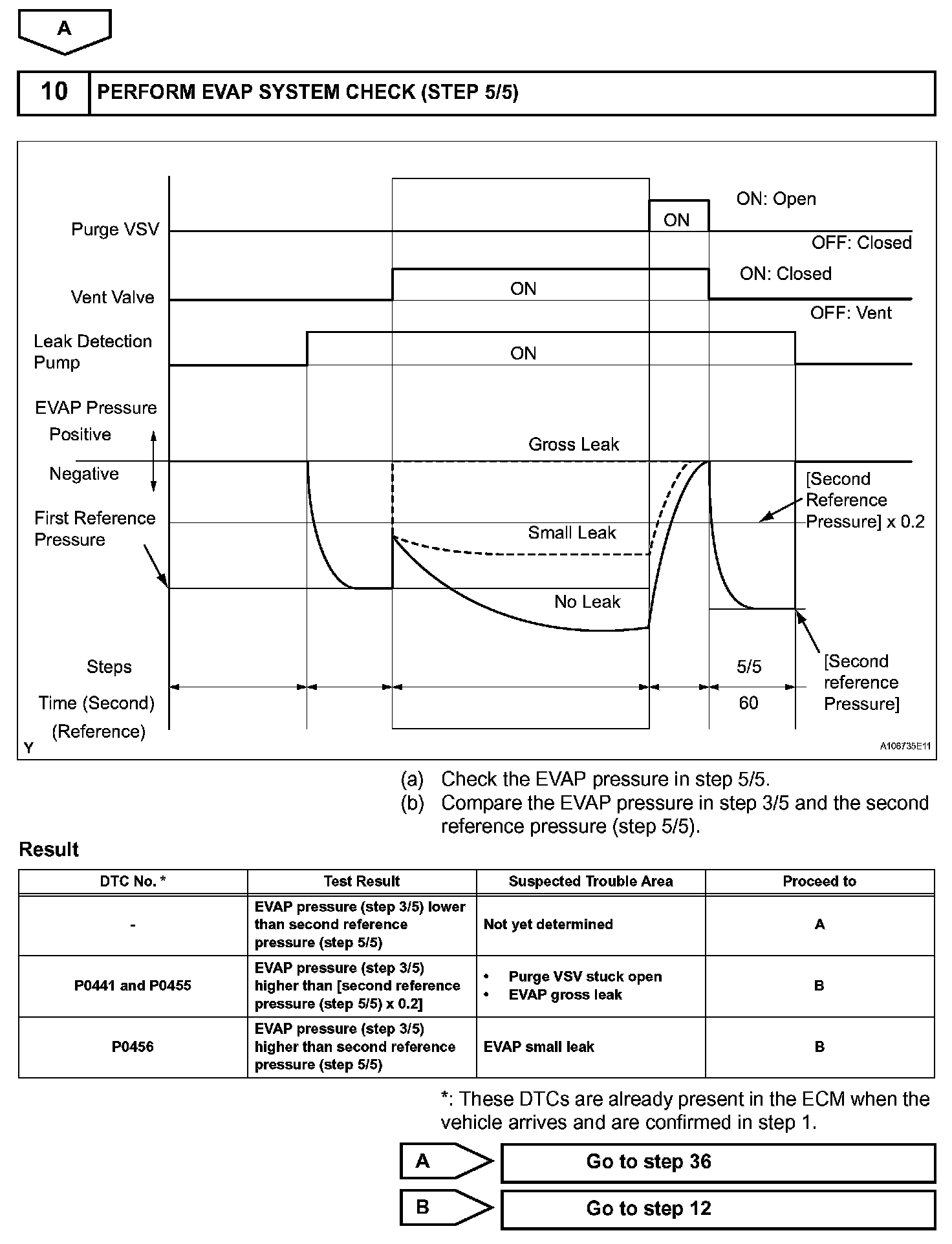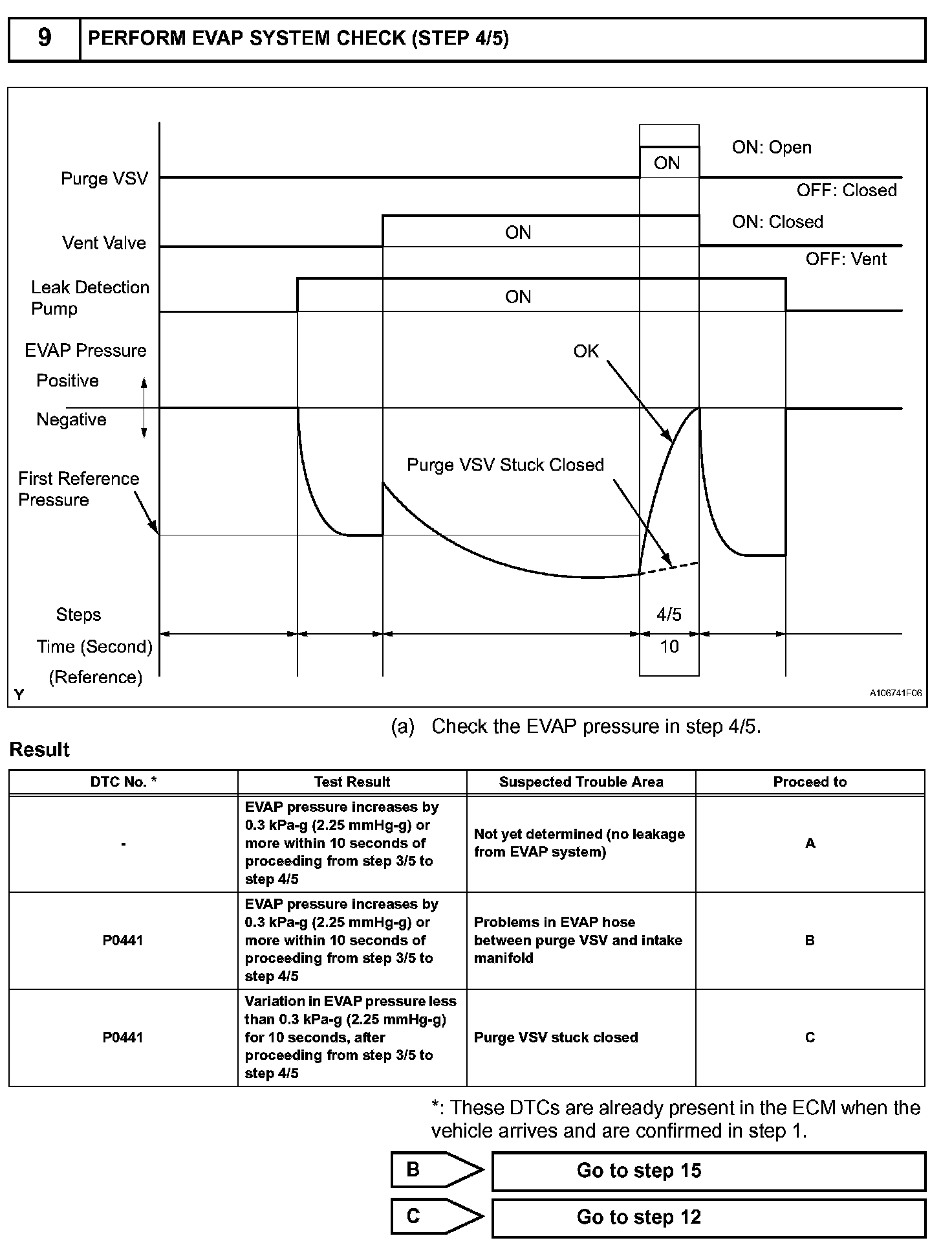 The vent valve turned OFF (open) and the EVAP pressure is then measured. If the variation in the pressure is less than 0.5 kPa-g (3.75 mmHg-g), the ECM interprets this as the purge VSV being stuck closed, and illuminates the MIL and sets DTC P0441 (2 trip detection logic).
