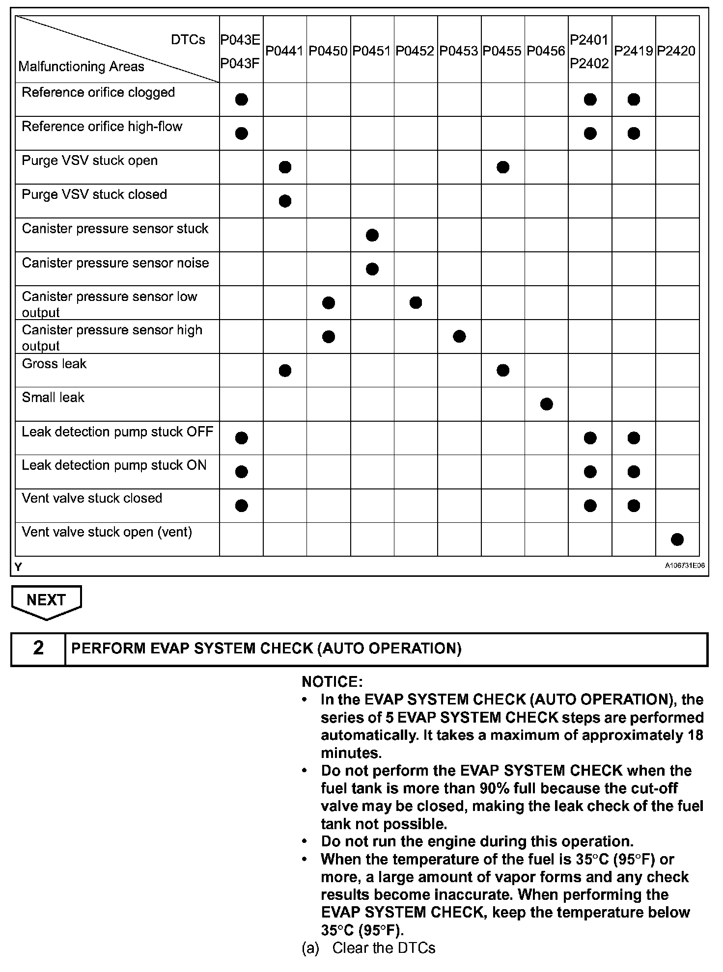 If any EVAP system DTCs are set, the malfunctioning area can be determined using the table.