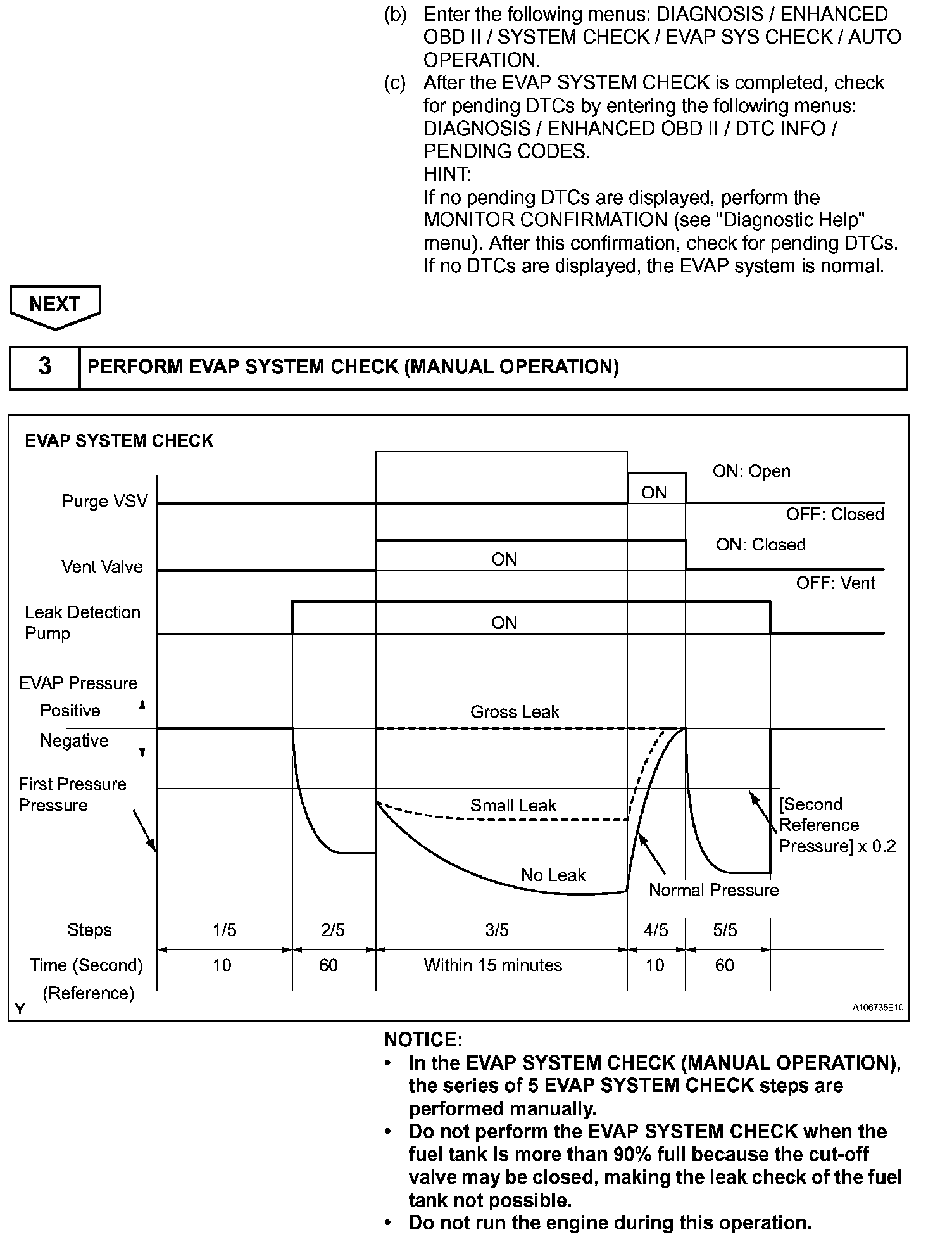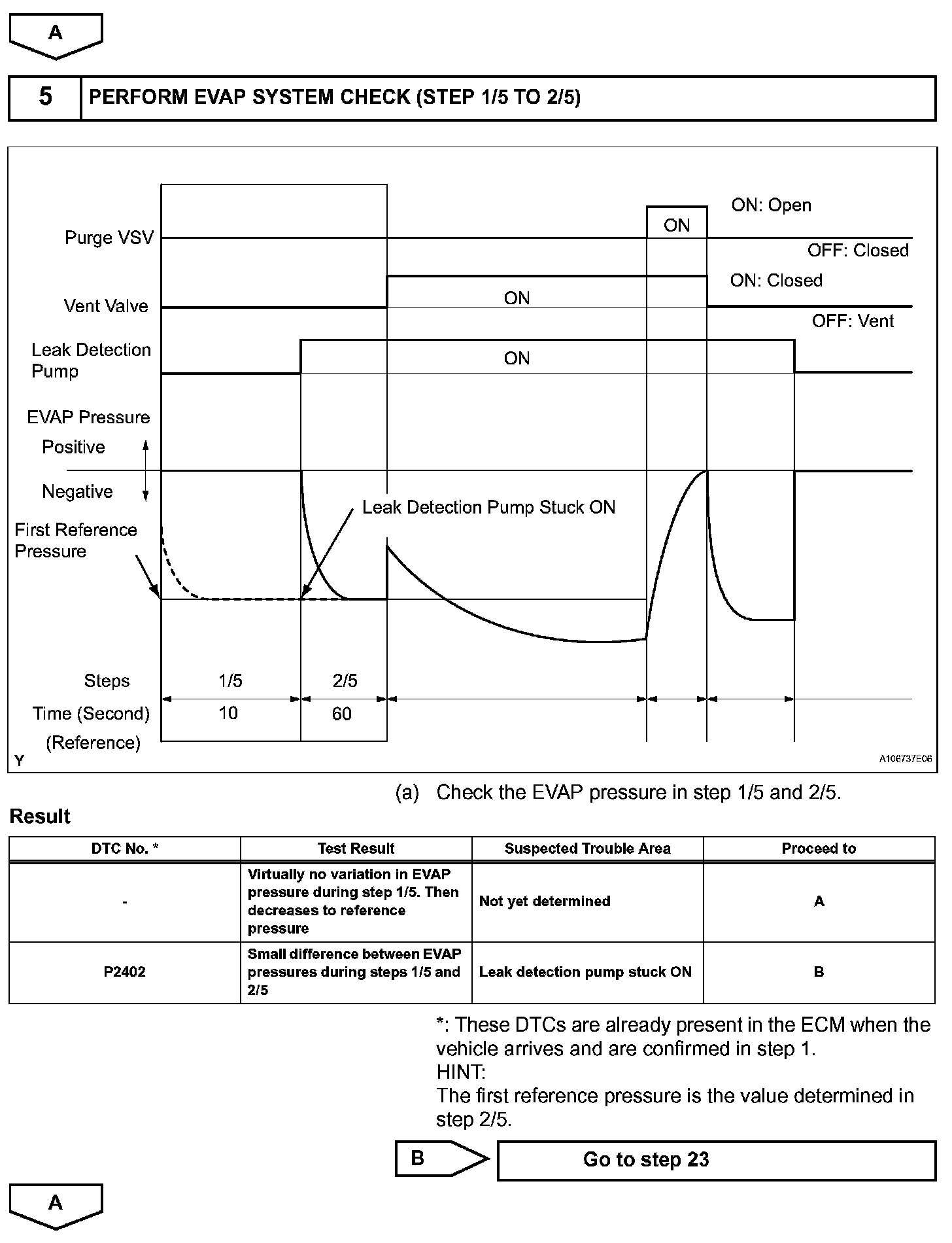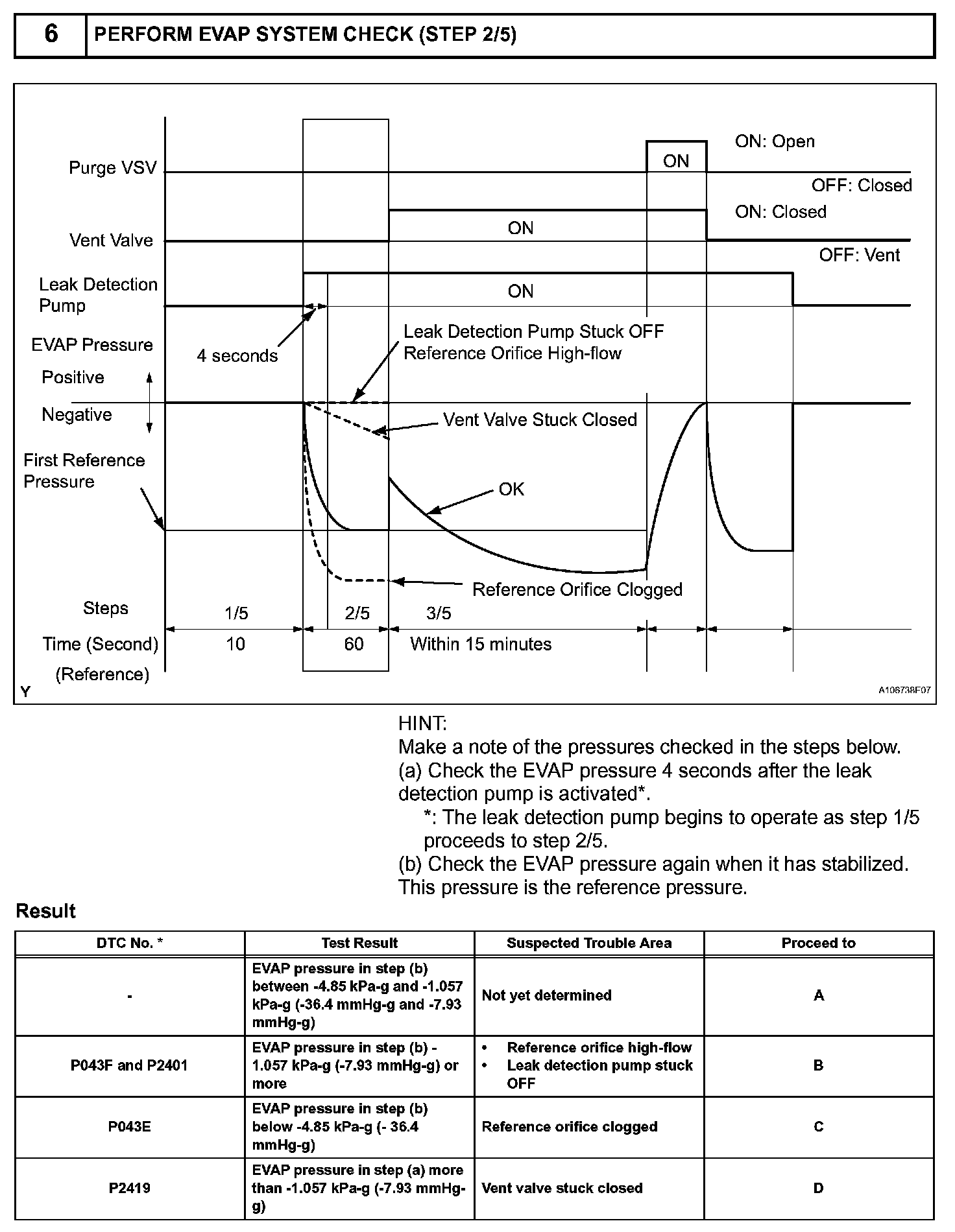 NOTE: If the reference pressure difference between the first and second checks is greater than the specification, the DTCs corresponding to the reference pressure (P043E, P043F, P2401, P2402 and P2419) will all be stored.