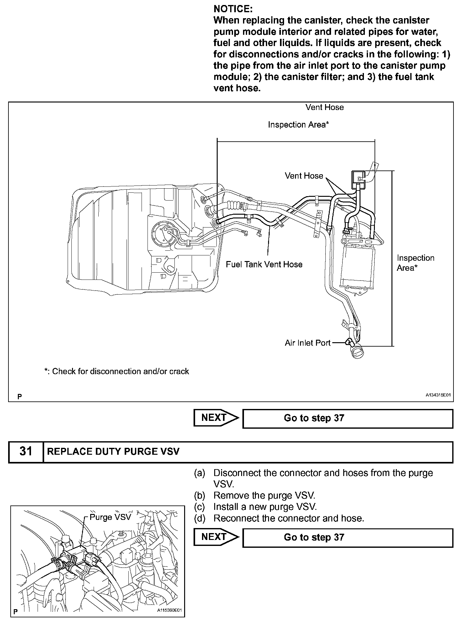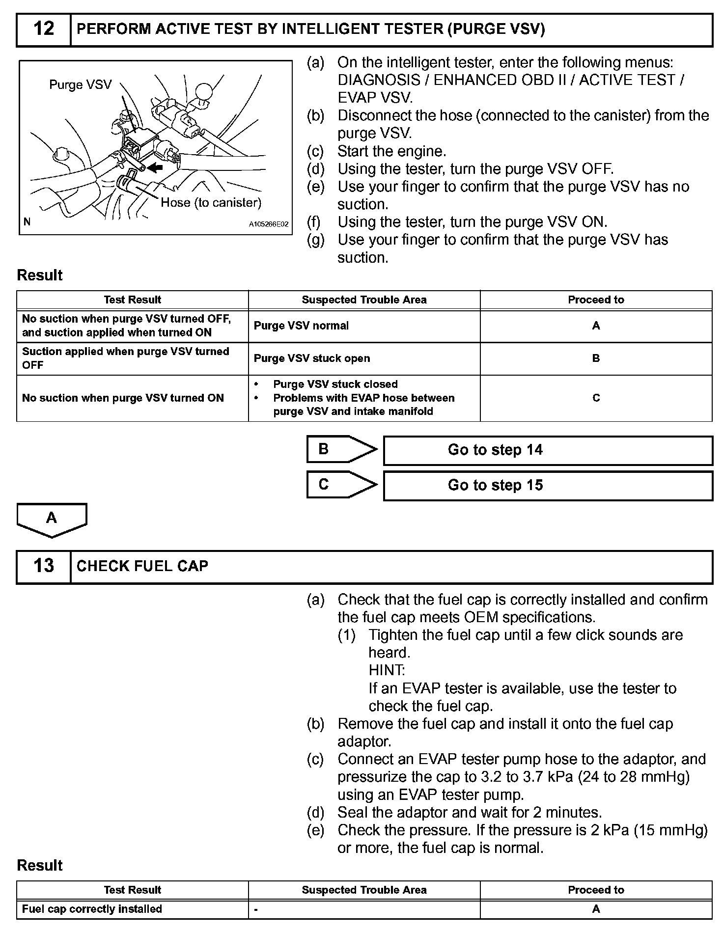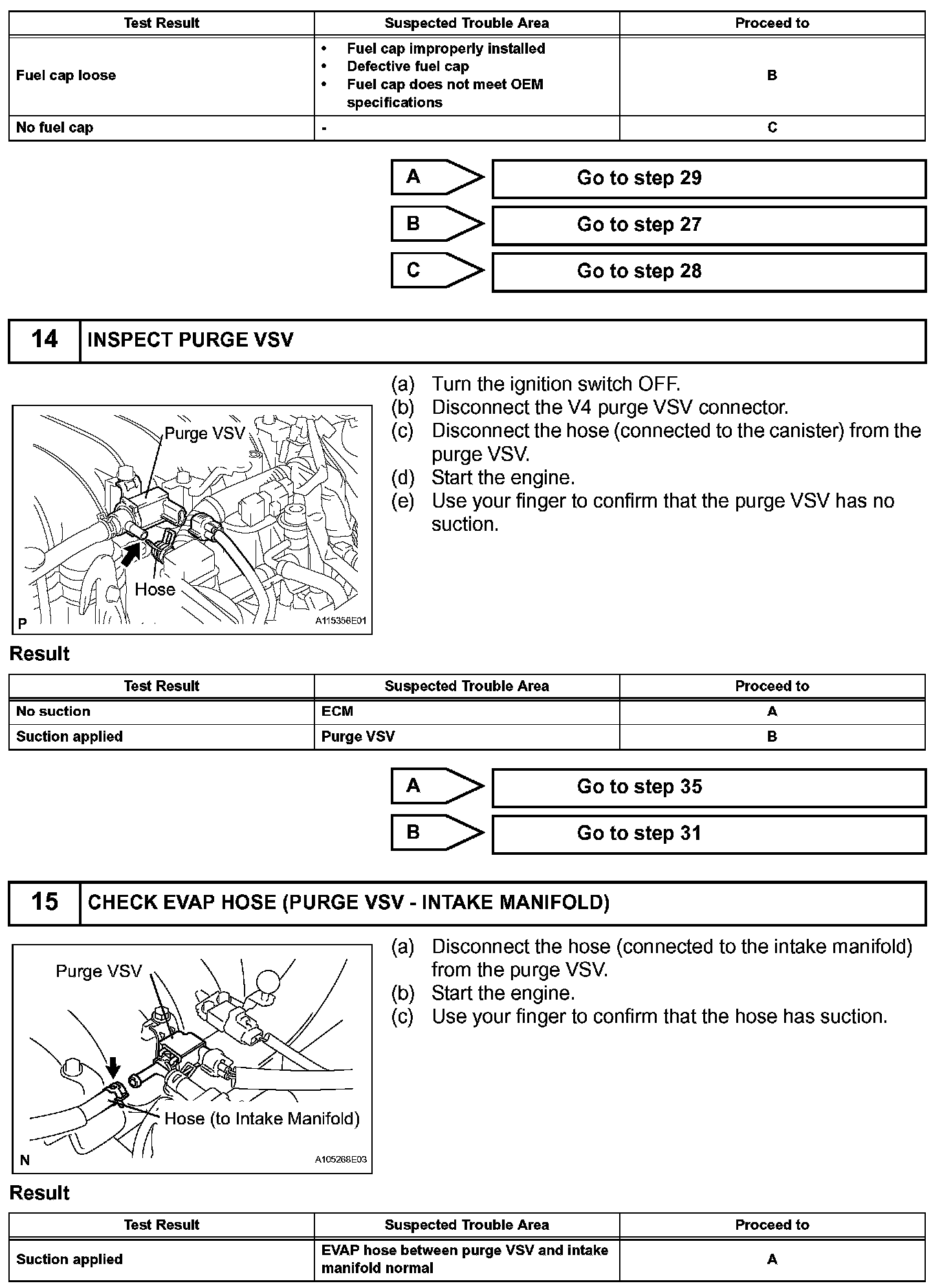 While the engine is running, if a predetermined condition (closed-loop etc.) is met, the purge VSV is opened by the ECM and stored fuel vapors in the canister are purged to the intake manifold. The ECM changes the duty cycle ratio of the purge VSV to control purge flow volume.