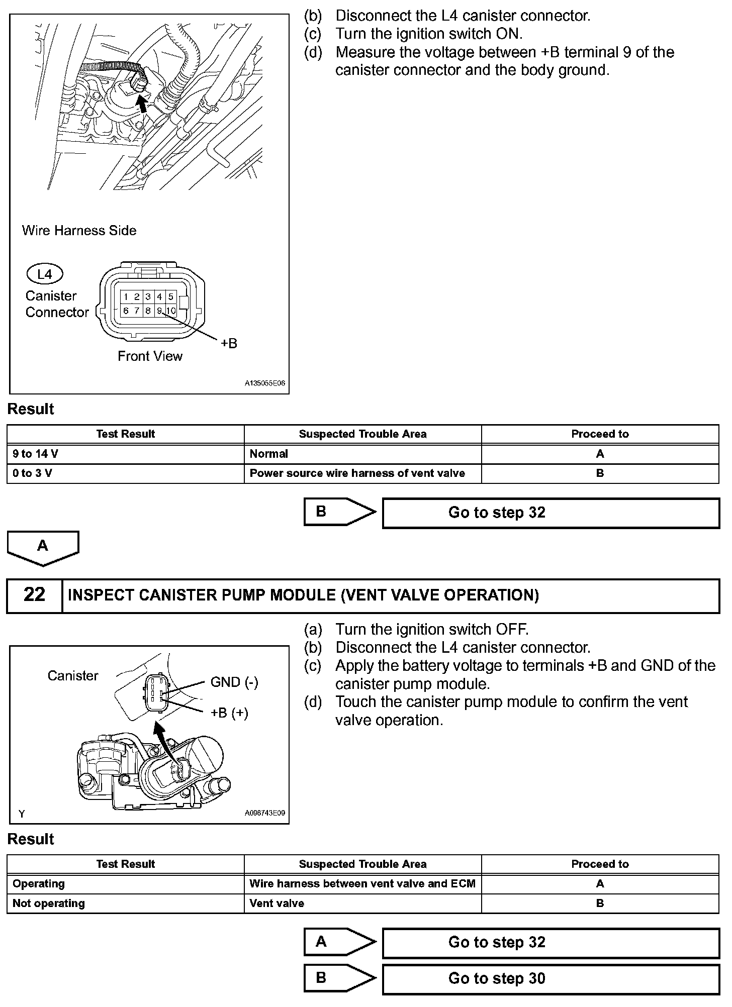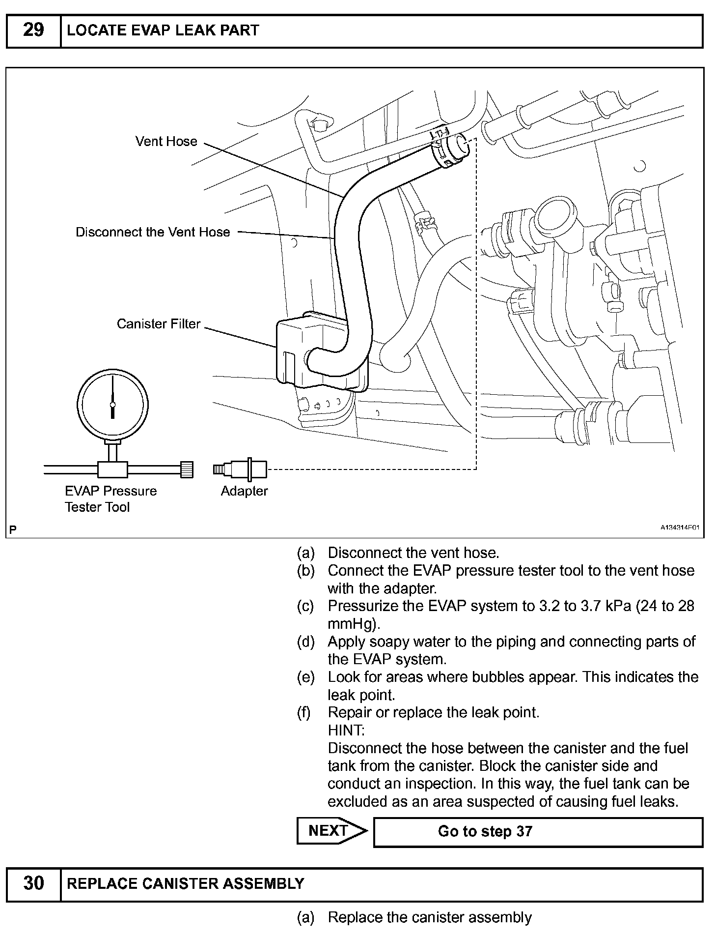 NOTE: In this vehicle's EVAP system, turning ON the vent valve does not seal off the EVAP system. To check for leaks in the EVAP system, disconnect the air inlet vent hose and apply pressure from the atmospheric side of the canister.