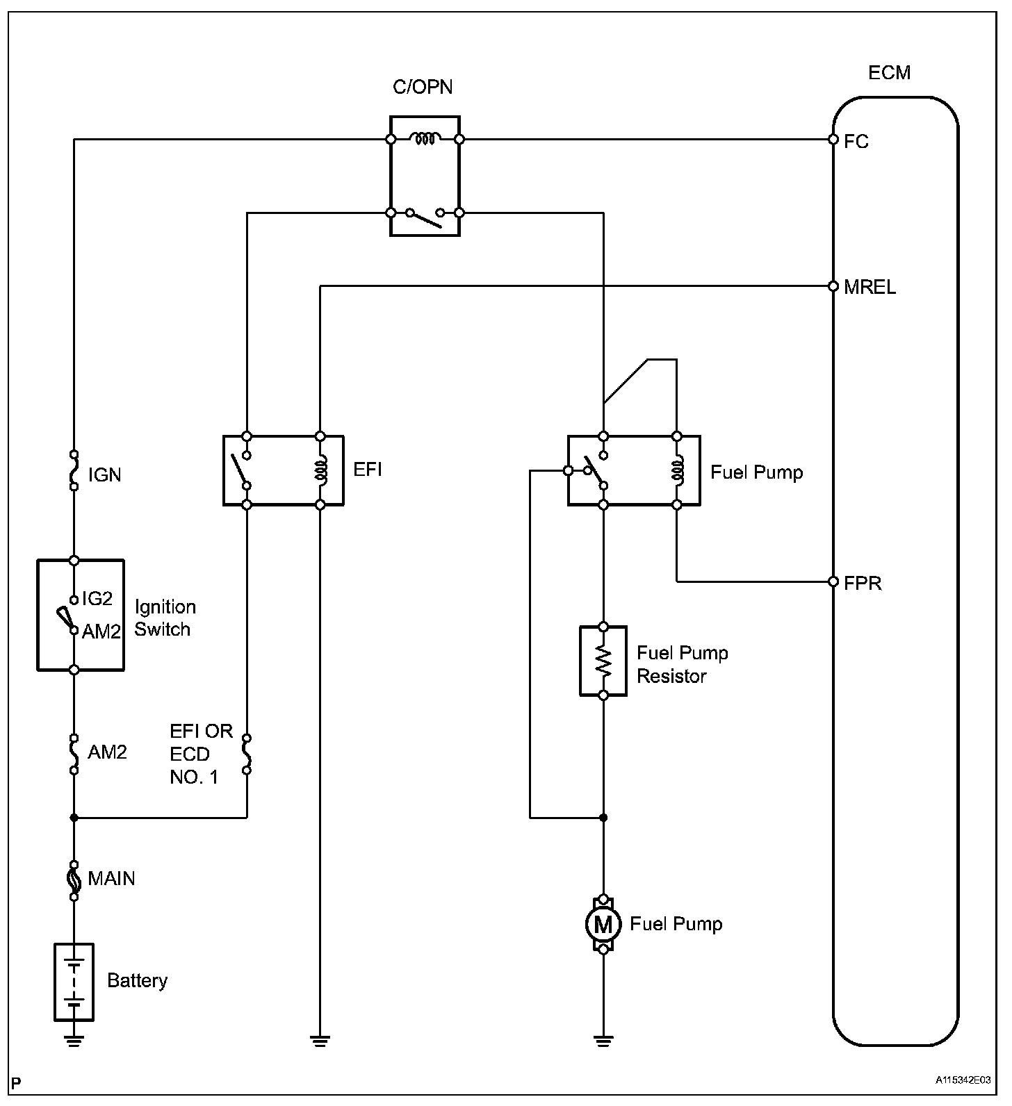 When the STA signal and NE signal are input to the ECM, the Tr1 (power transistor 1. is turned ON, current flows to the coil of the circuit opening relay (Marking: C/OPN), the relay switches on, power is supplied to the fuel pump, and the fuel pump operates.