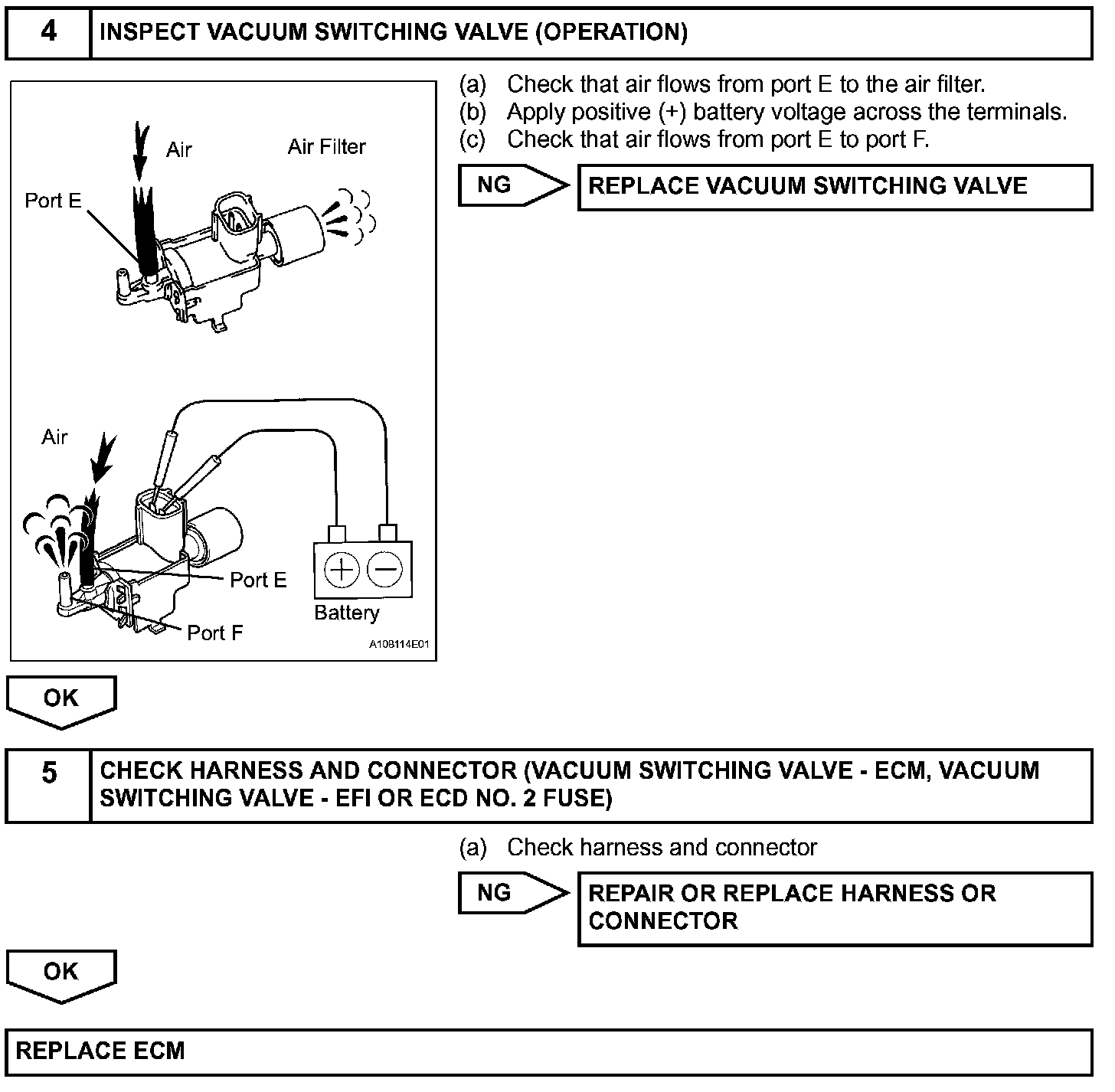 When the engine speed is 4,700 rpm or more and the throttle valve opening angle is 60° or more, the IACV is open (VSV: OFF). At all other times, the IACV is closed (VSV: ON).