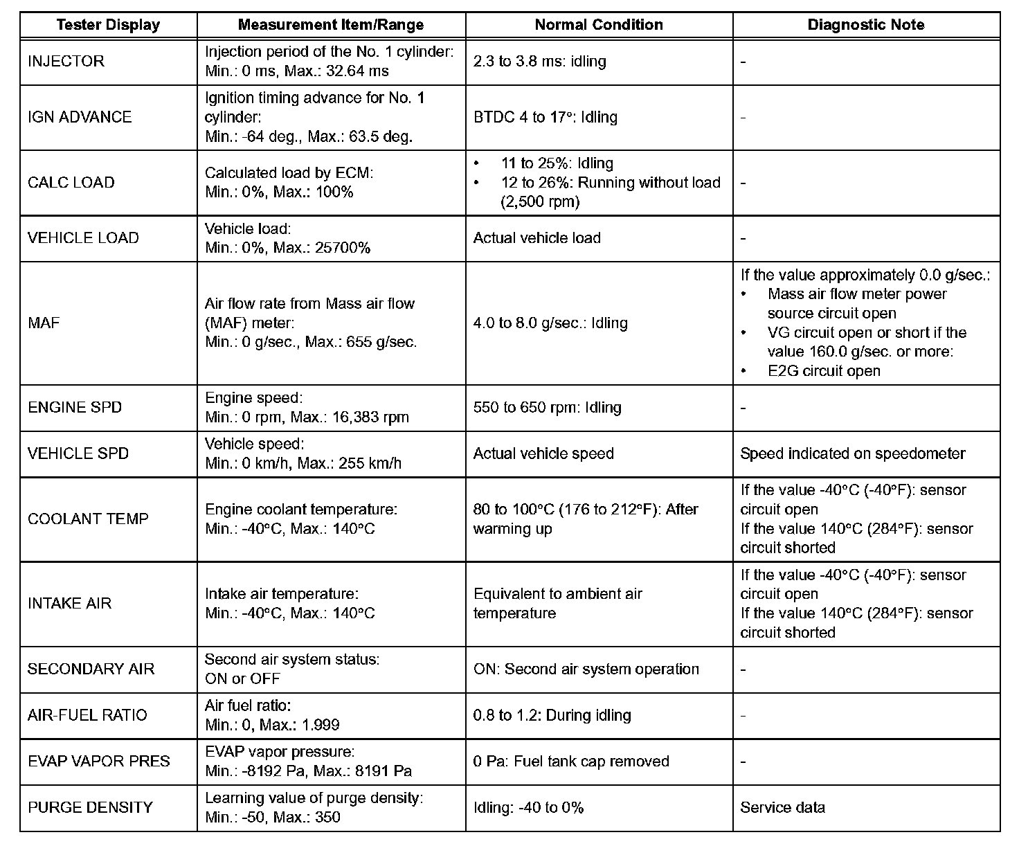 NOTE: In the table, the values listed under "Normal Condition" are reference values. Do not depend solely on these reference values when deciding whether a part is faulty or not.