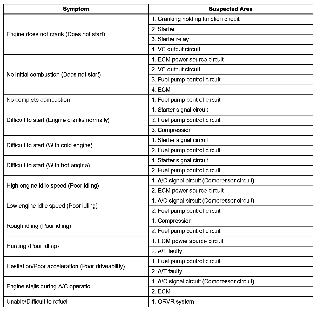 HINT: Use the table to help determine the cause of the problem symptom. The potential causes of the symptoms are listed in order of probability in the "Suspected Area" column of the table. Check each symptom by checking the suspected areas in the order they are listed. Replace parts as necessary.