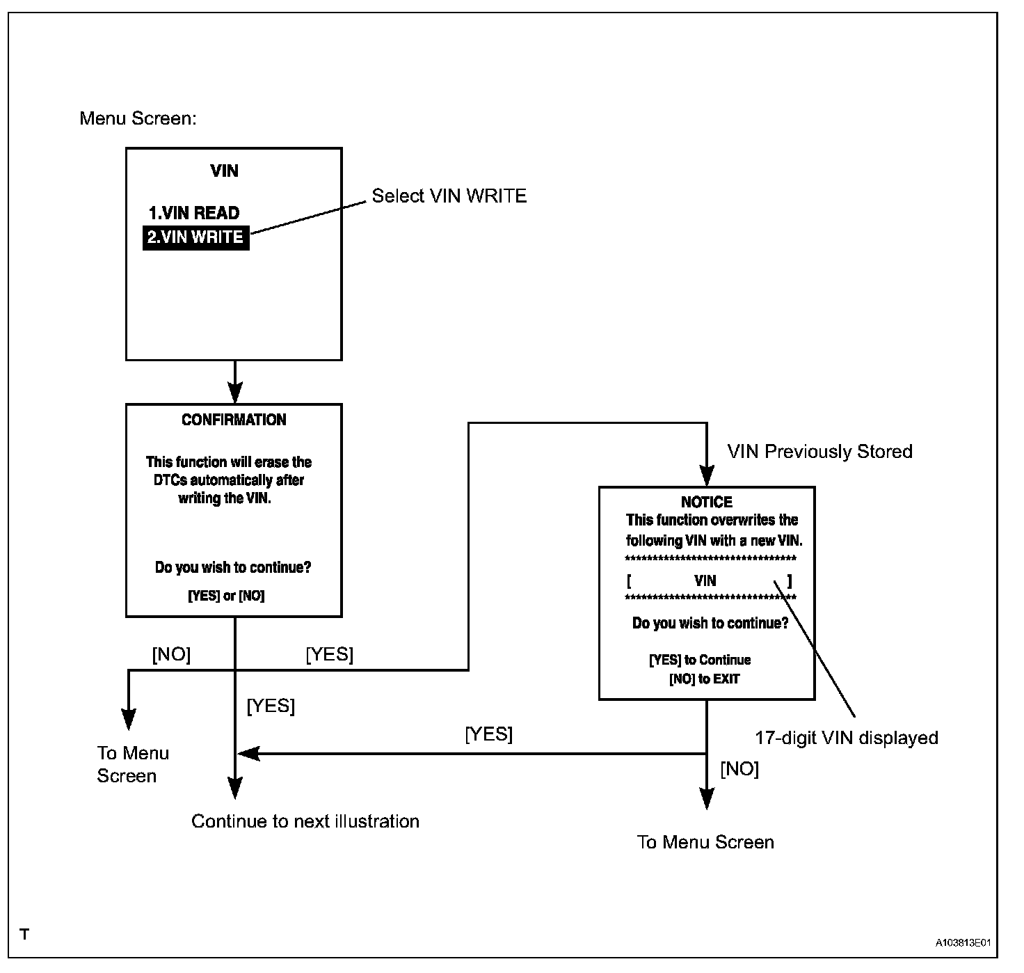 HINT: The VIN writing instructions. Use the procedures and flowchart. This process allows the VIN to be input into the ECM. If the ECM is changed, or the ECM VIN and Vehicle VIN do not match, the VIN can be registered or overwritten in the ECM by following this procedure.