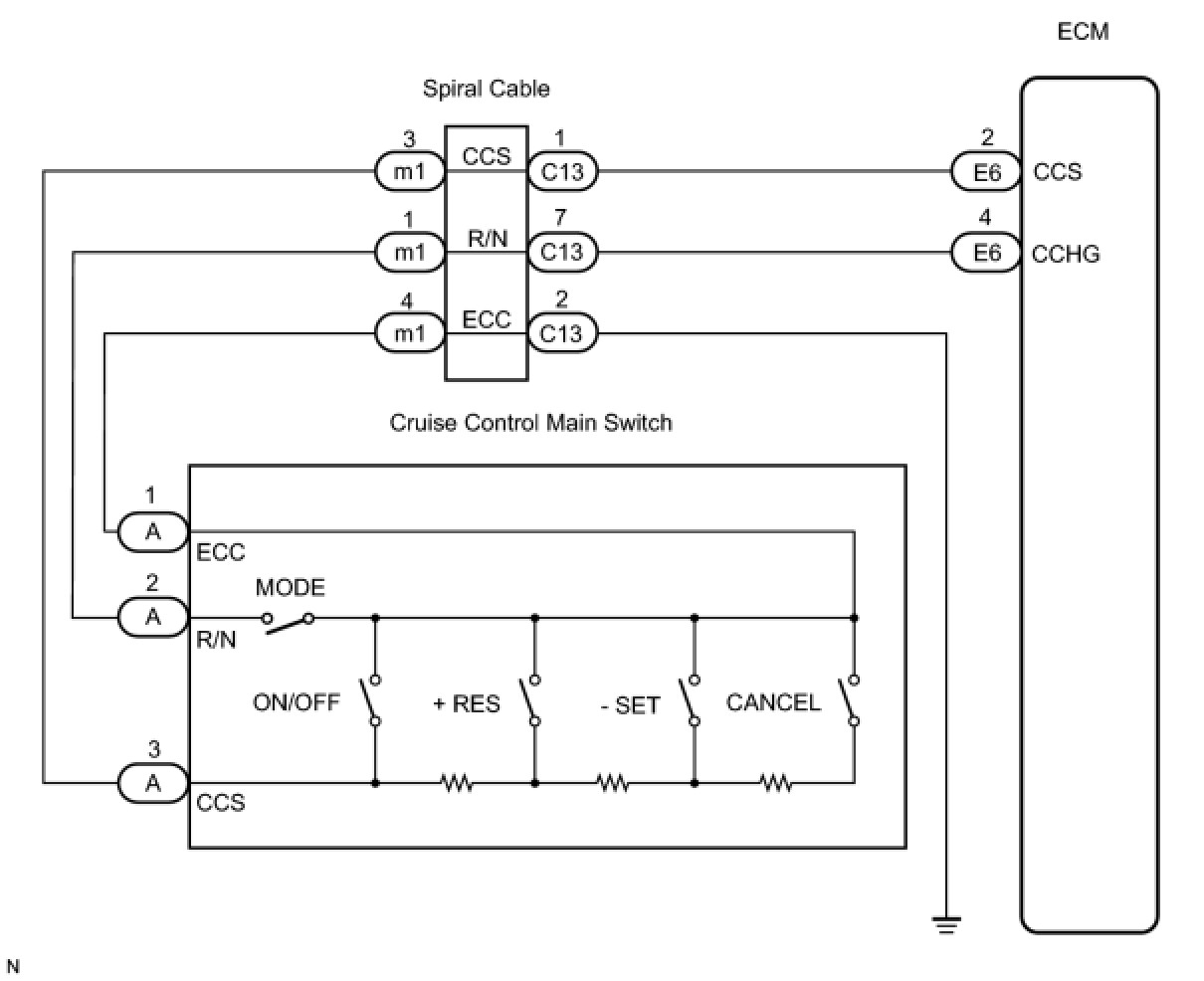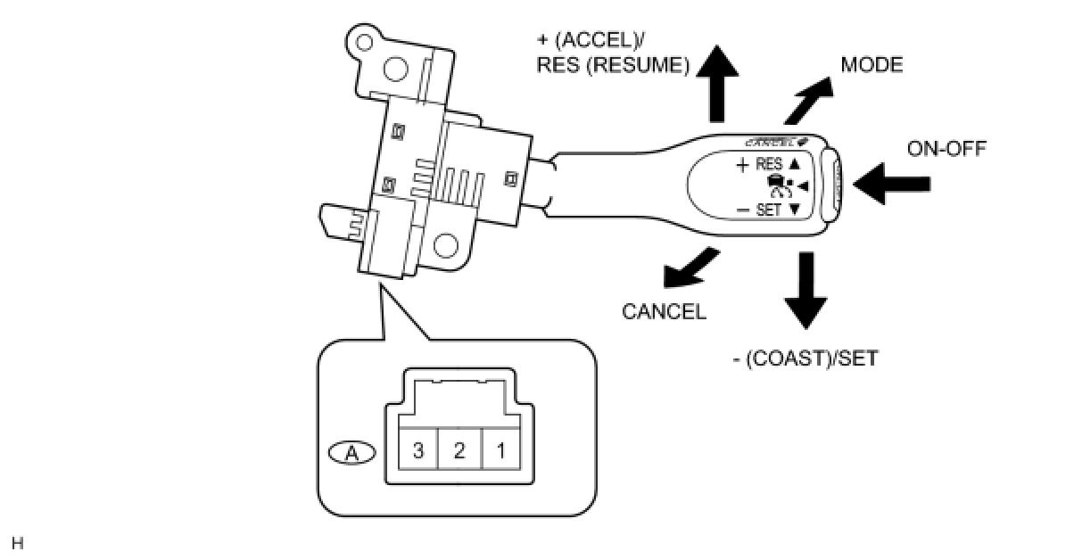 The cruise control main switch operates 8 functions: SET, - (COAST), TAP-DOWN, RES (RESUME), + (ACCEL), TAP-UP, CANCEL, and MODE. The SET, TAP-DOWN, and - (COAST) functions, and the RES (RESUME), TAP-UP, and + (ACCEL) functions are operated with the same switch. The cruise control main switch is an automatic return type switch which turns on only while operating it in the direction of each arrow and turns off after releasing it. The internal contact point of the cruise control main switch is turned on with the switch operation. The ECM then reads the voltage value that has been changed by the switch operation to control MODE, SET, - (COAST), RES (RESUME), + (ACCEL), and CANCEL. The dynamic laser cruise control system has two cruise control modes: the constant speed control mode and vehicle-to-vehicle distance control mode.