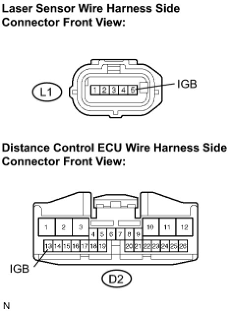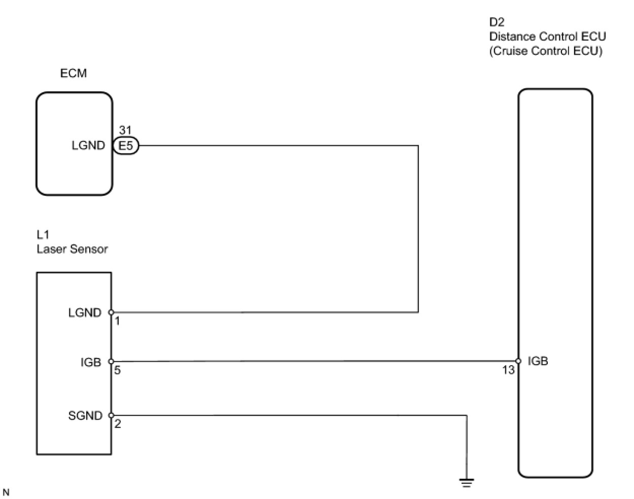 This circuit provides power to the laser sensor. The laser sensor emits radio waves towards an object in front and measures the distance and direction of the object by receiving the beam reflections. Based on the reflections, the sensor calculates the difference in speed between the vehicle and the object in front. This data is transmitted to the distance control ECU (cruise control ECU). The ECM recognizes the laser sensor via terminals LGND. If an open circuit occurs in the wire harness between terminals LGND, the ECM cannot recognize the laser sensor. The ECM will stop the control of the vehicle-to-vehicle distance control mode and only the constant speed control mode can be used.