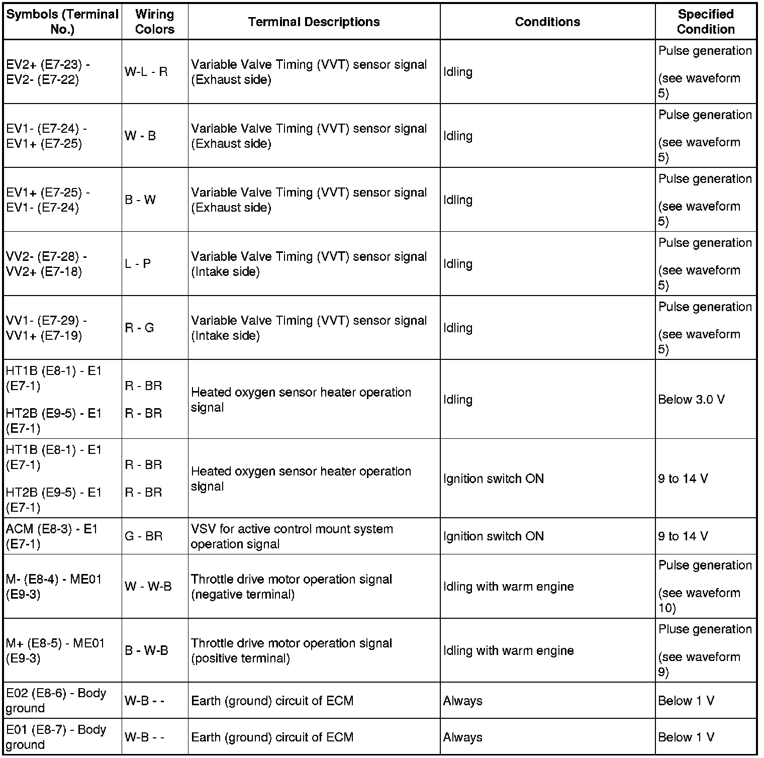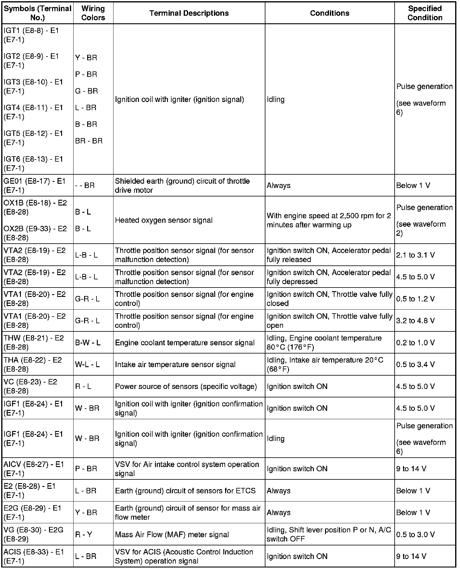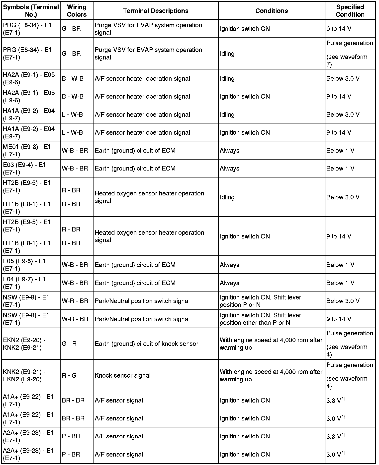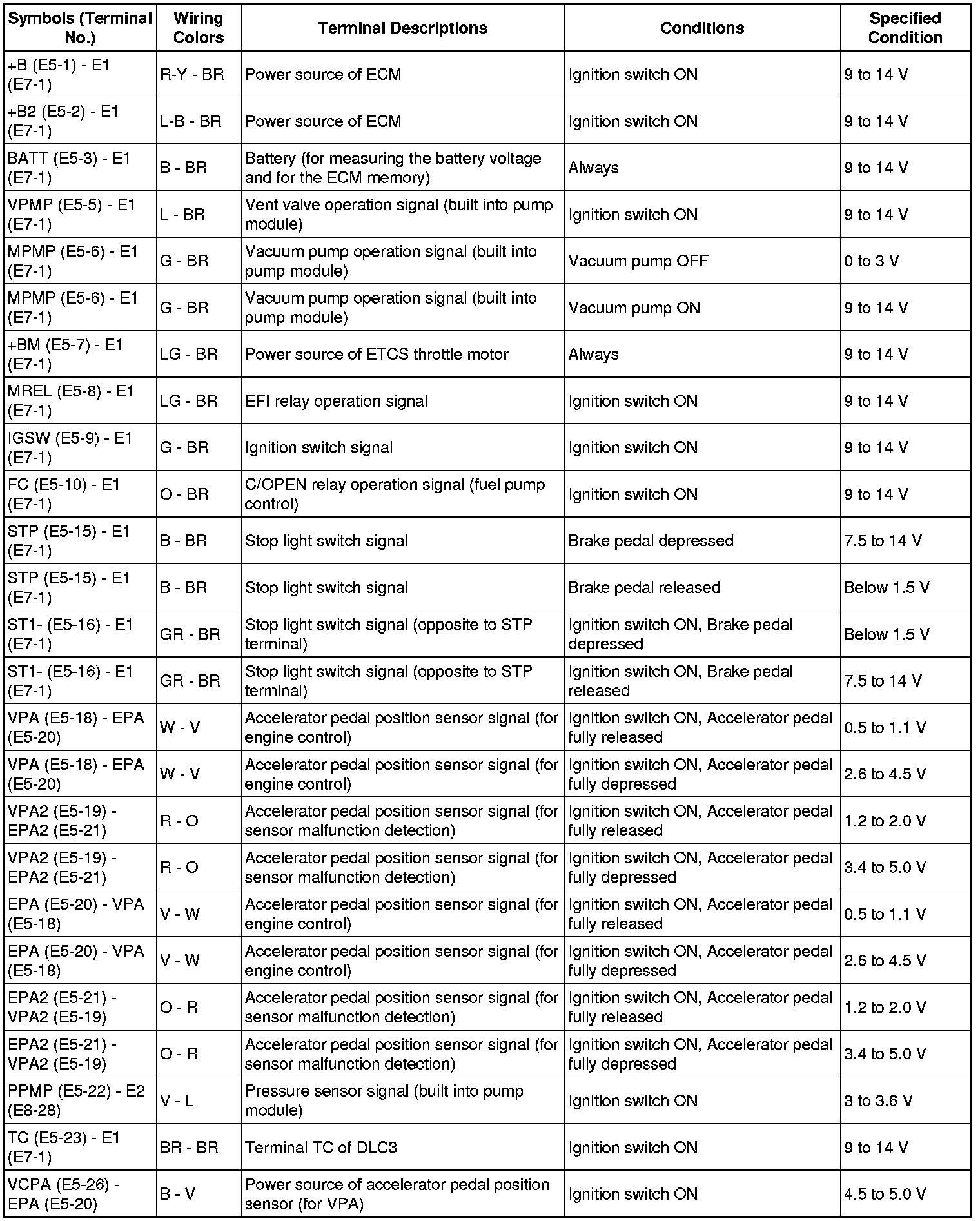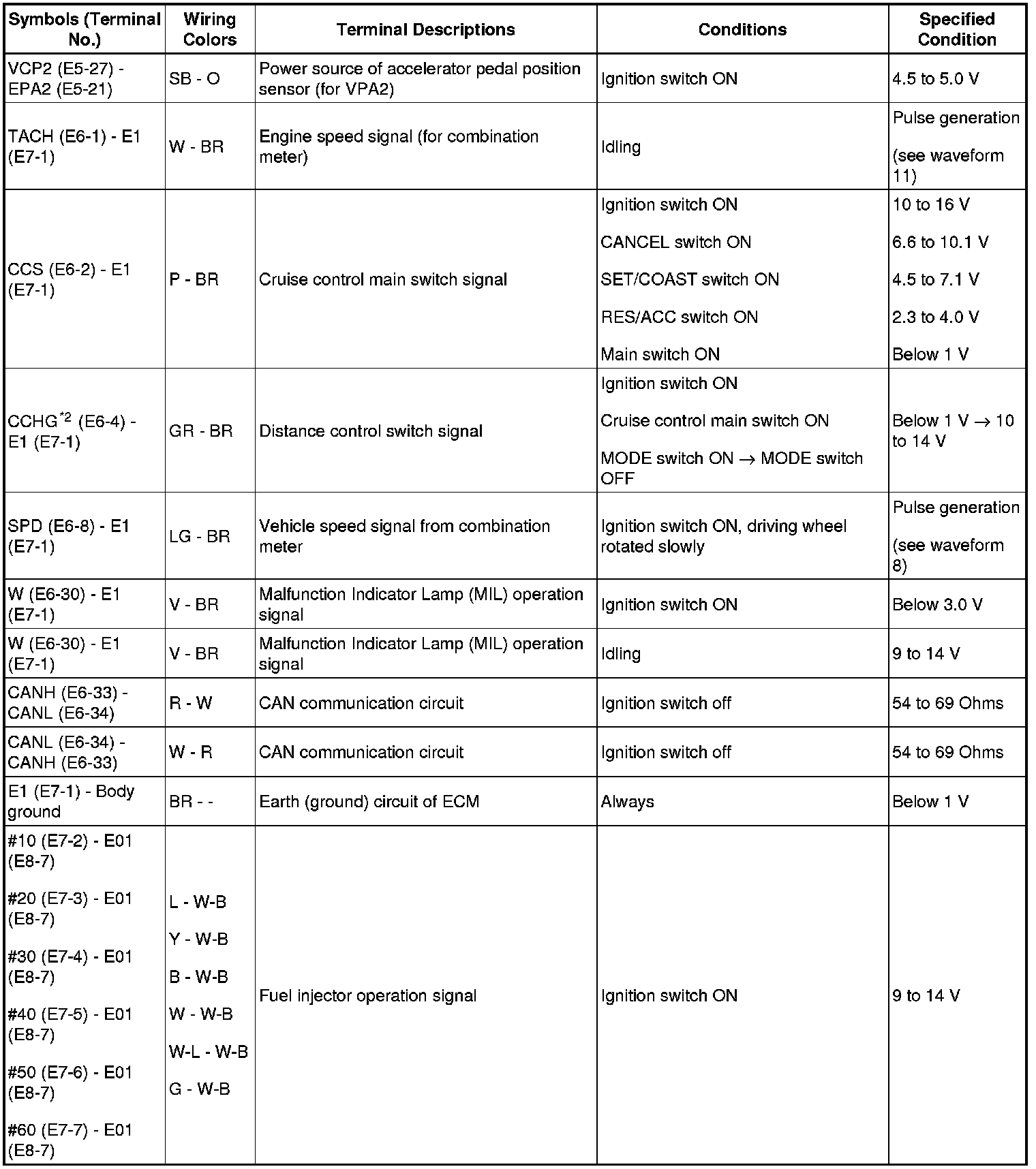 HINT: The standard normal voltage between each pair of the ECM terminals is shown in the table below. The appropriate conditions for checking each pair of the terminals are also indicated.