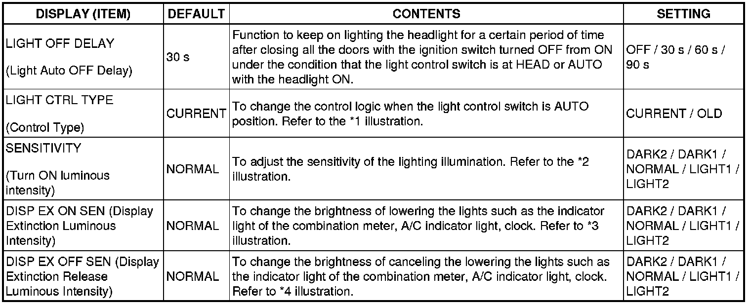 **2: Delay time until the headlight is turned on when it suddenly gets dark.