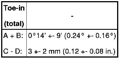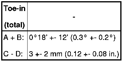 If the toe-in is not within the specified value, inspect the suspension parts and replace them if necessary.