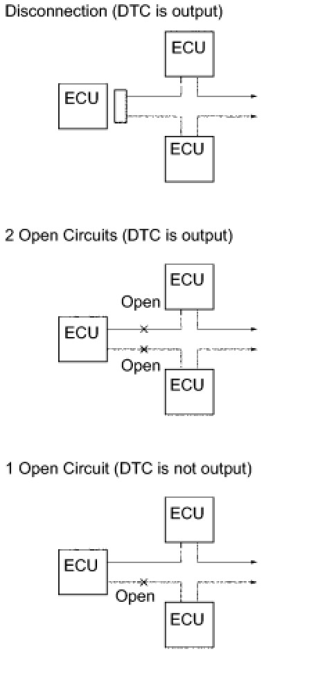 (b) If DTC indicating ECU communication stop is output, the connectors may be disconnected or the communication buses may be open at 2 points. Only 1 communication bus open will not set DTC.