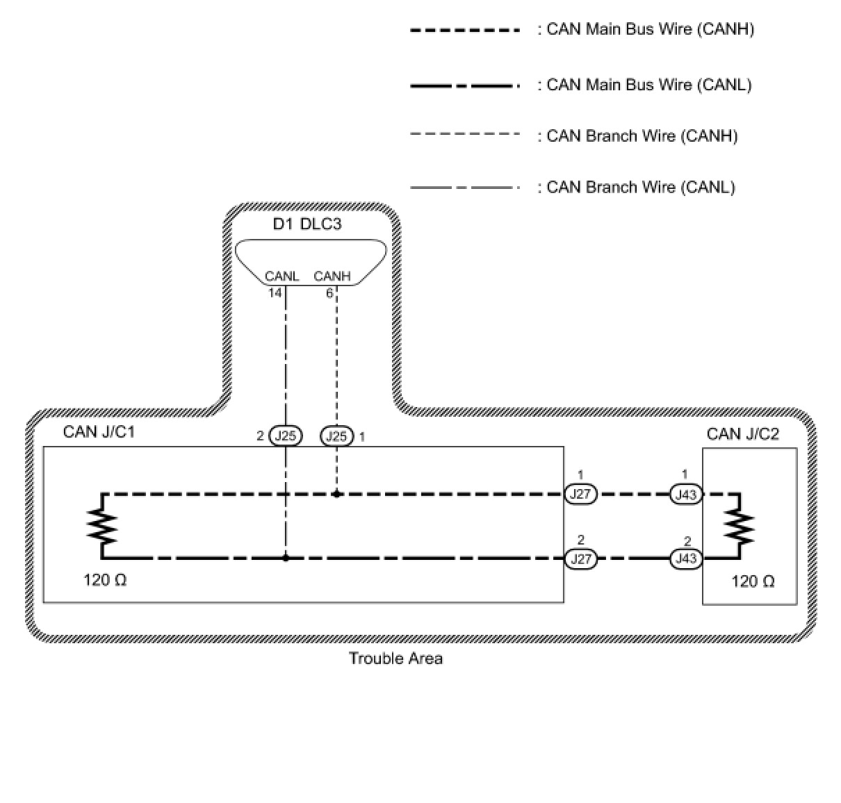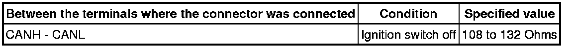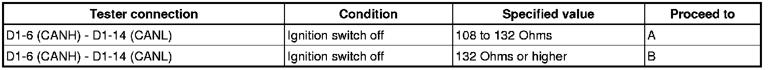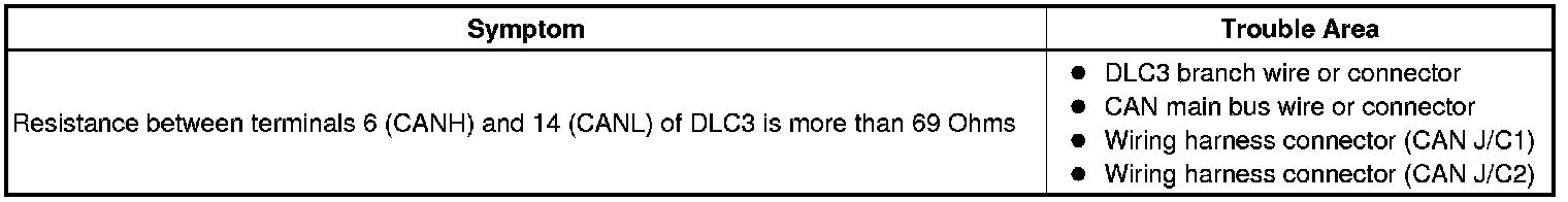 The CAN main bus wire must be disconnected when the resistance between terminals 6 (CANH) and 14 (CANL) of the DLC3 is more than 69 Ohms.