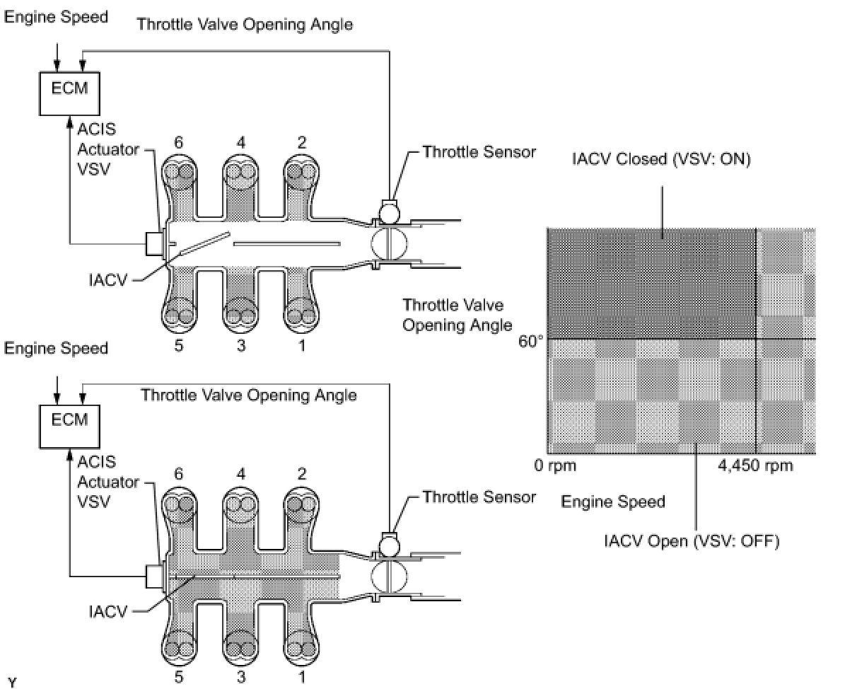 When the engine speed is between 0 and 4,450 rpm and the throttle valve opening angle is 60° or more, the ECM supplies current to the VSV (ON status), to close the IACV. Under other conditions, the VSV is usually OFF and the IACV is open.