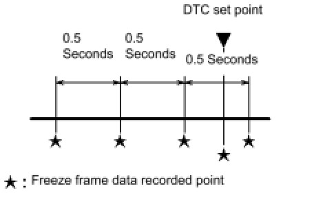 (b) The ECM records engine conditions in the form of freeze frame data every 0.5 seconds. Using the intelligent tester, five separate sets of freeze frame data, including the data values at the time when the DTC was set, can be checked.