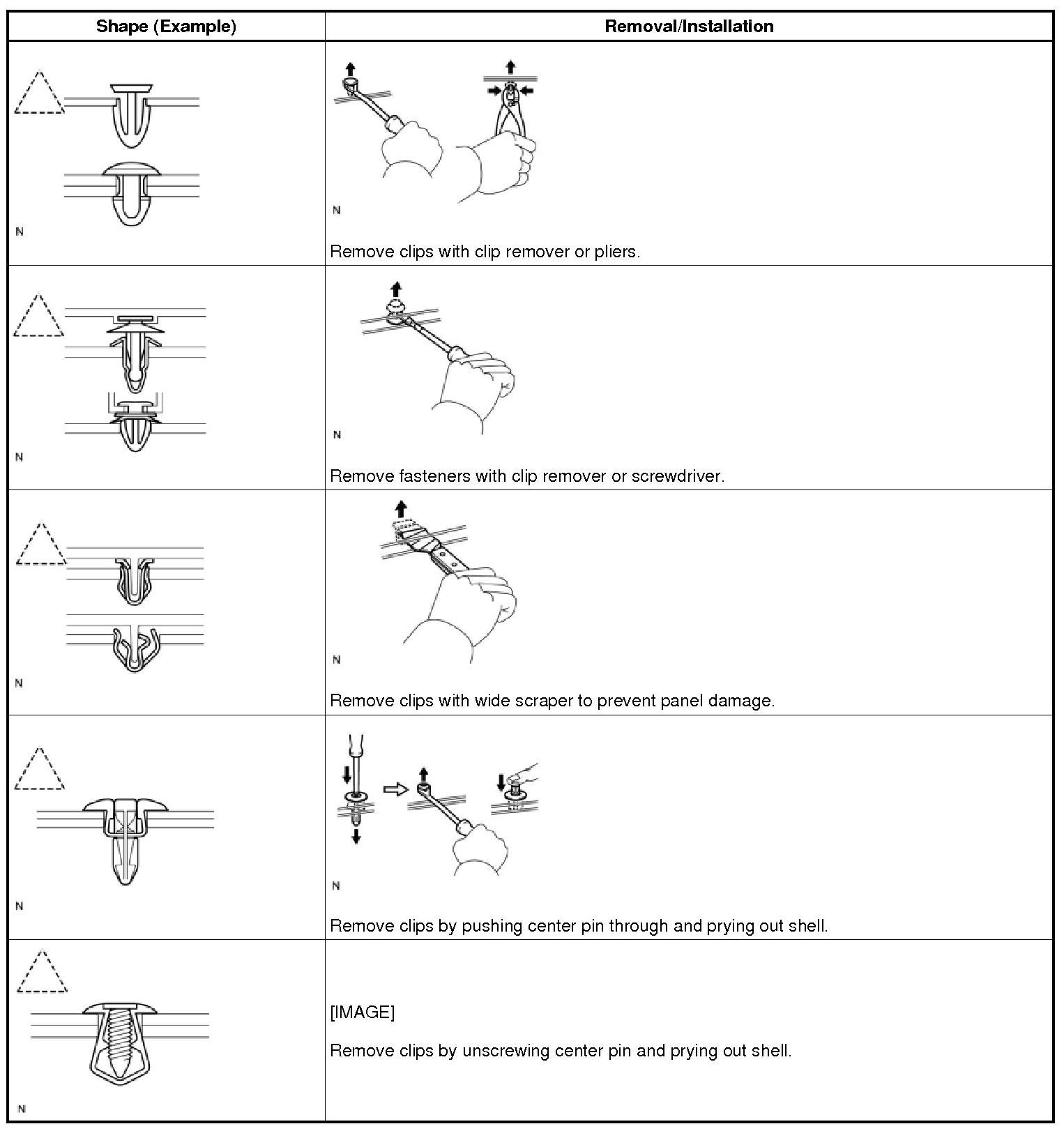 (1) The removal and installation methods of typical clips used for vehicle body parts are shown in the table below.