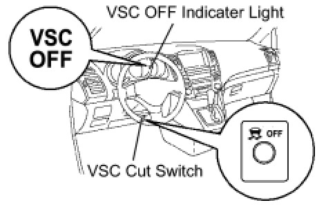 When using a 2-wheel drum tester such as a speedometer tester or chassis dynamometer, etc., or jacking up the front wheels and driving the wheels, always push in the VSC cut ("VSC OFF") switch and turn the TRAC and VSC system OFF.