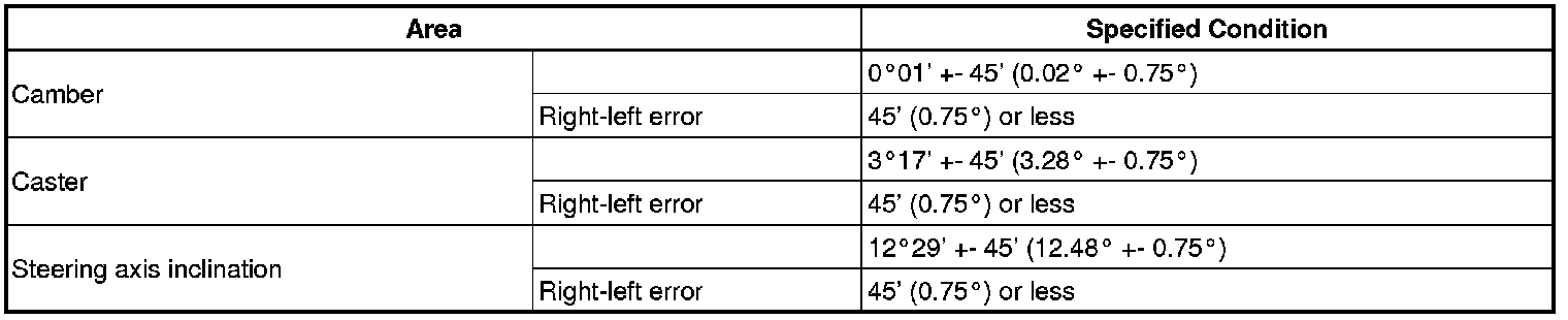 If the steering axis inclination is not as specified after camber and caster have been correctly adjusted, recheck the steering knuckle and front wheel for distortion or looseness.