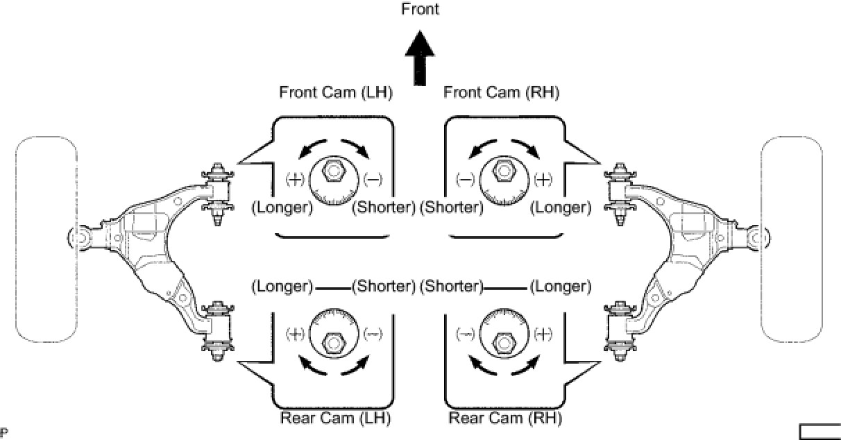 (b) Turn the camber adjust cam No. 2 and toe adjust plate No. 2 in the circumference direction, and adjust the camber and the caster.