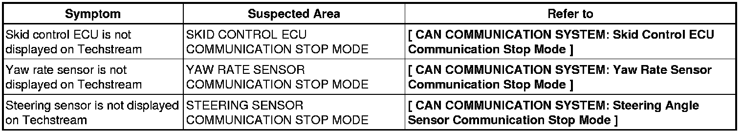 (b) Check the communication stop mode of the ECUs or sensors not displayed among the following: "Engine", "ABS/VSC/TRAC", "Yaw / Deceleration Sensor" or "Steering Angle Sensor".