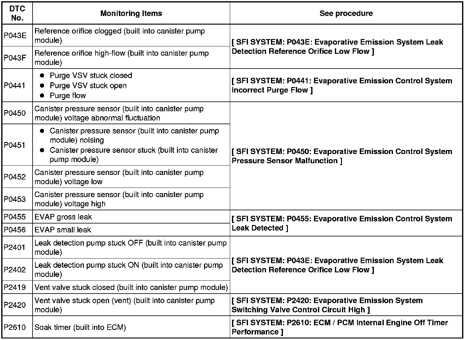 If the 0.02 inch leak criterion difference between the first and second checks is greater than the specification, the DTCs corresponding to the 0.02 inch leak criterion (P043E, P043F, P0441, P0455, P0456, P2401 and P2420) will all be stored.