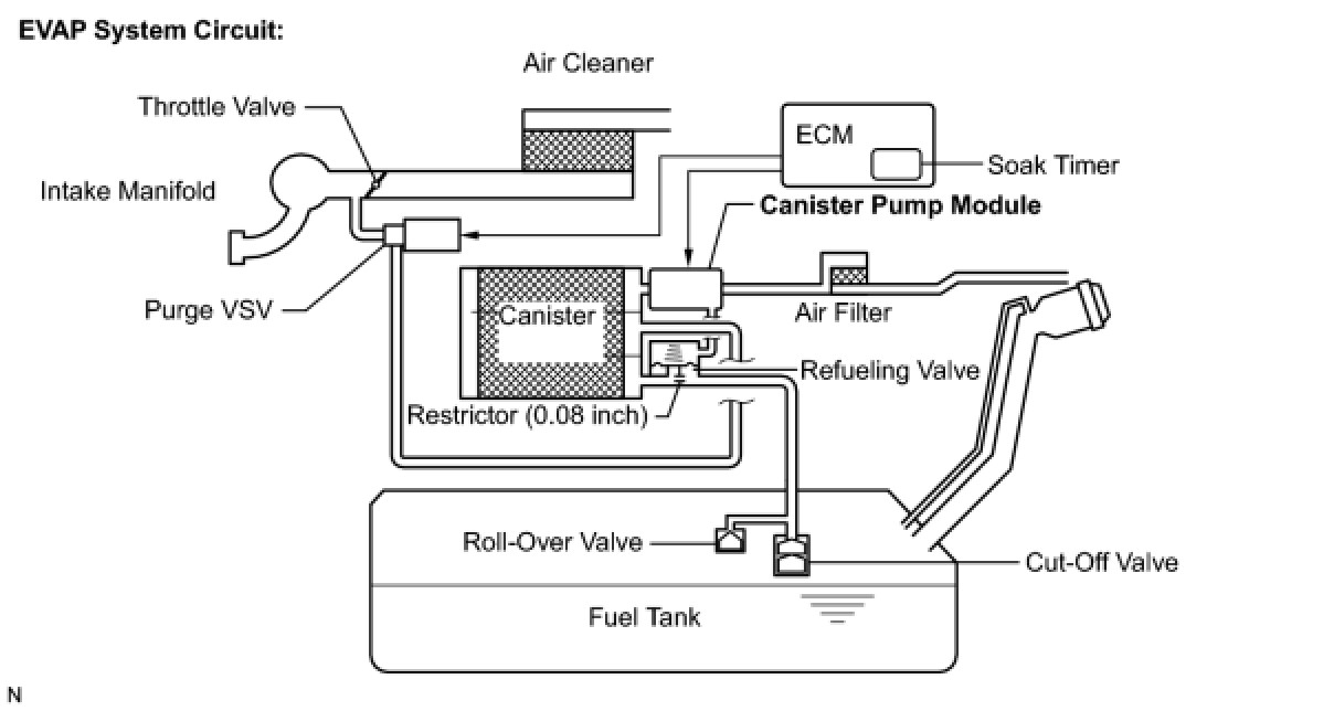 The leak detection pump creates negative pressure (vacuum) in the EVAP system and the pressure is measured. Finally, the ECM monitors for leaks from the EVAP system and malfunctions in both the canister pump module and purge VSV, based on the EVAP pressure.