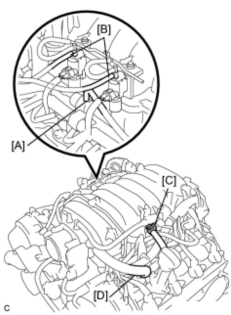 (d) Disconnect the 2 vacuum hoses [D] from the VSV for the air injection system.