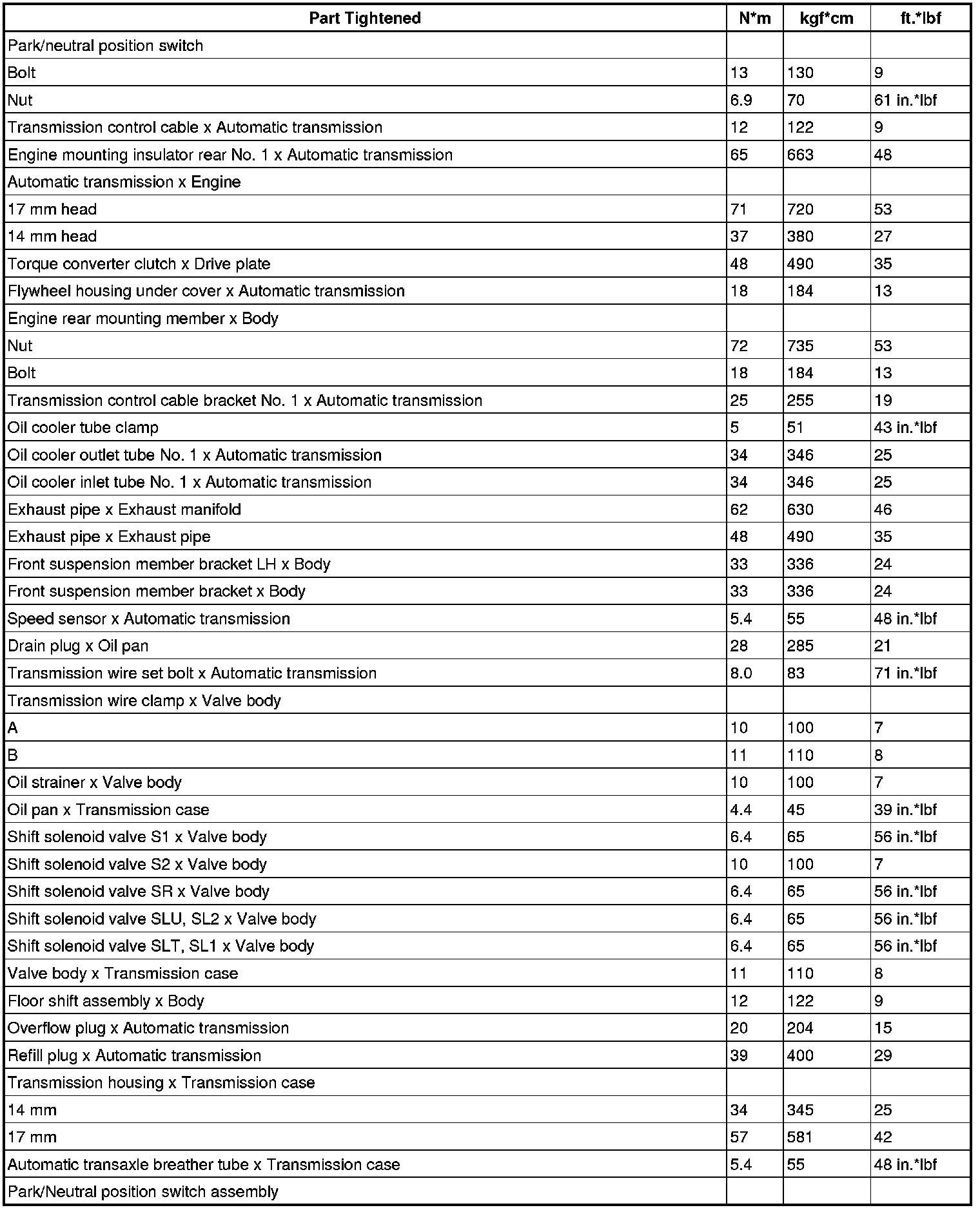 SERVICE SPECIFICATIONS: A750F AUTOMATIC TRANSMISSION: TORQUE SPECIFICATIONS