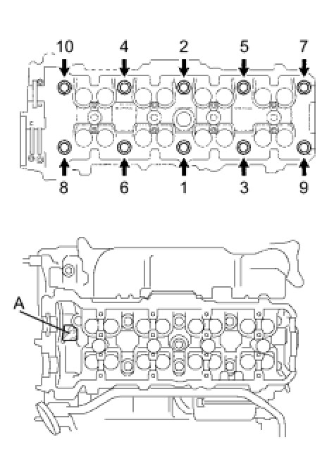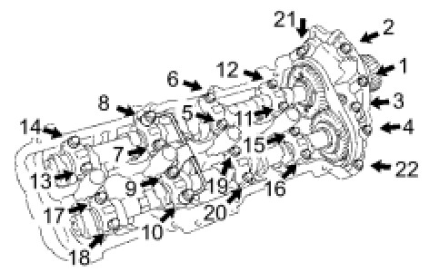 Install and uniformly tighten the 6 bolts and 4 nuts in several steps.