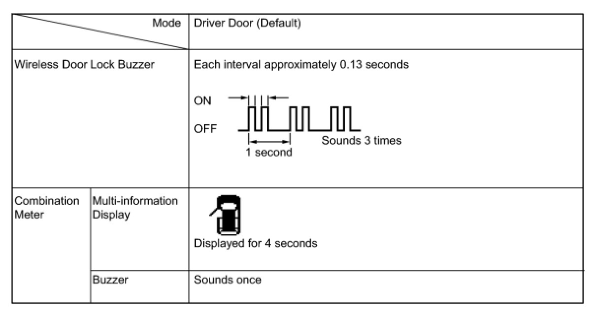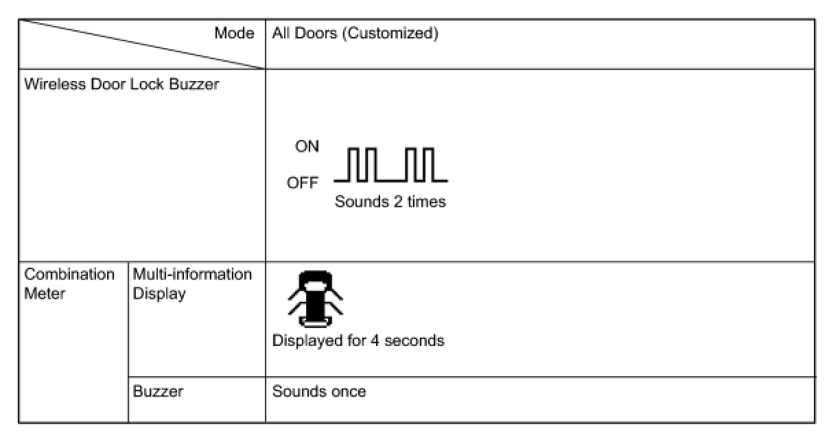 (c) The certification ECU (smart key ECU assembly) sounds the wireless door lock buzzer and combination meter buzzer to inform the user that the mode has been switched.